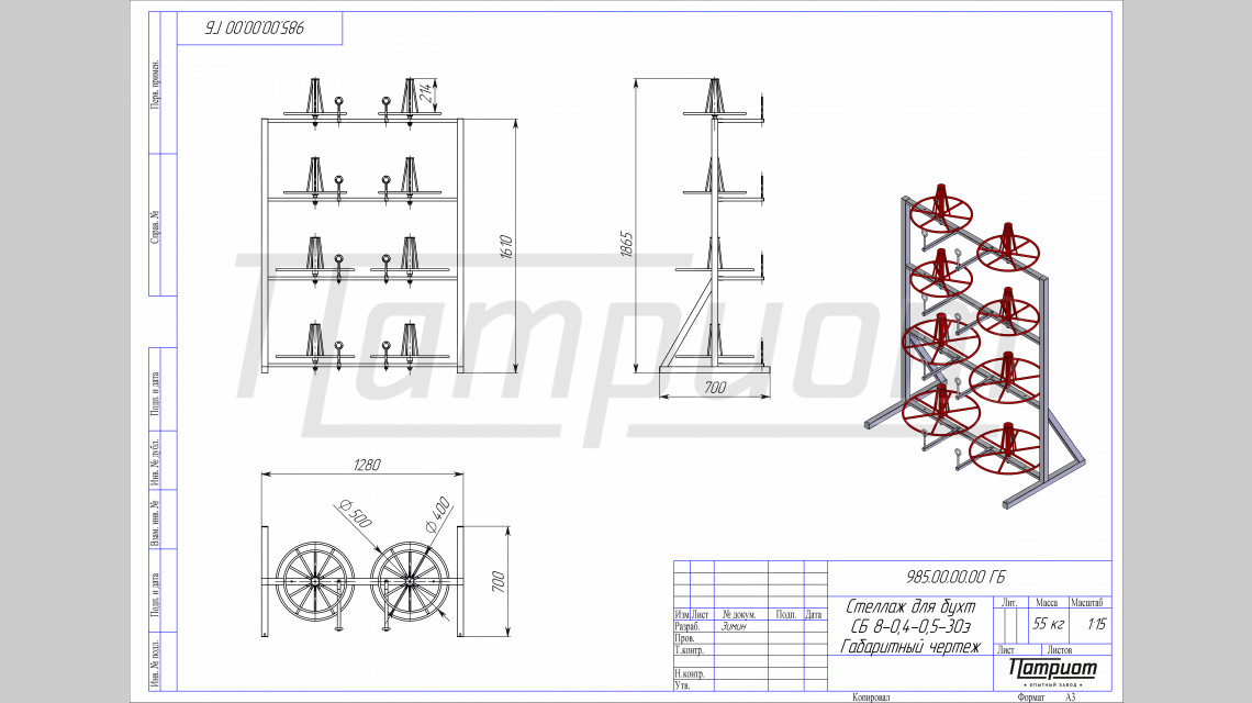 Кабельная стойка СБ 8-0, 4-0,5-30э - стационарный стеллаж для хранения кабельных бухт производства Опытного завода "Патриот".