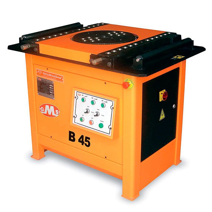 Станок для гибки арматуры GOCMAKSAN B-45 предназначен для использования в строительстве и на производстве при интенсивных нагрузках. Оборудование гнет арматурную сталь диаметром до 45 мм. Загиб производится путем вращения диска с механическим приводом. Управление осуществляется автоматизированной электрической системой. Данная система обеспечивает быстрое и качественное выполнение гибки арматуры под необходимыми углами. Загибочный диск работает в ручном и автоматическом режиме, вращаясь по и против часовой стрелки. Различные аксессуары и насадки позволяют осуществлять различные виды нестандартных загибов. Станок GOCMAKSAN B-45 также является очень долговечным, поскольку все его силовые аппараты изготовлены из стали, прошедшей агрессивную термическую обработку.