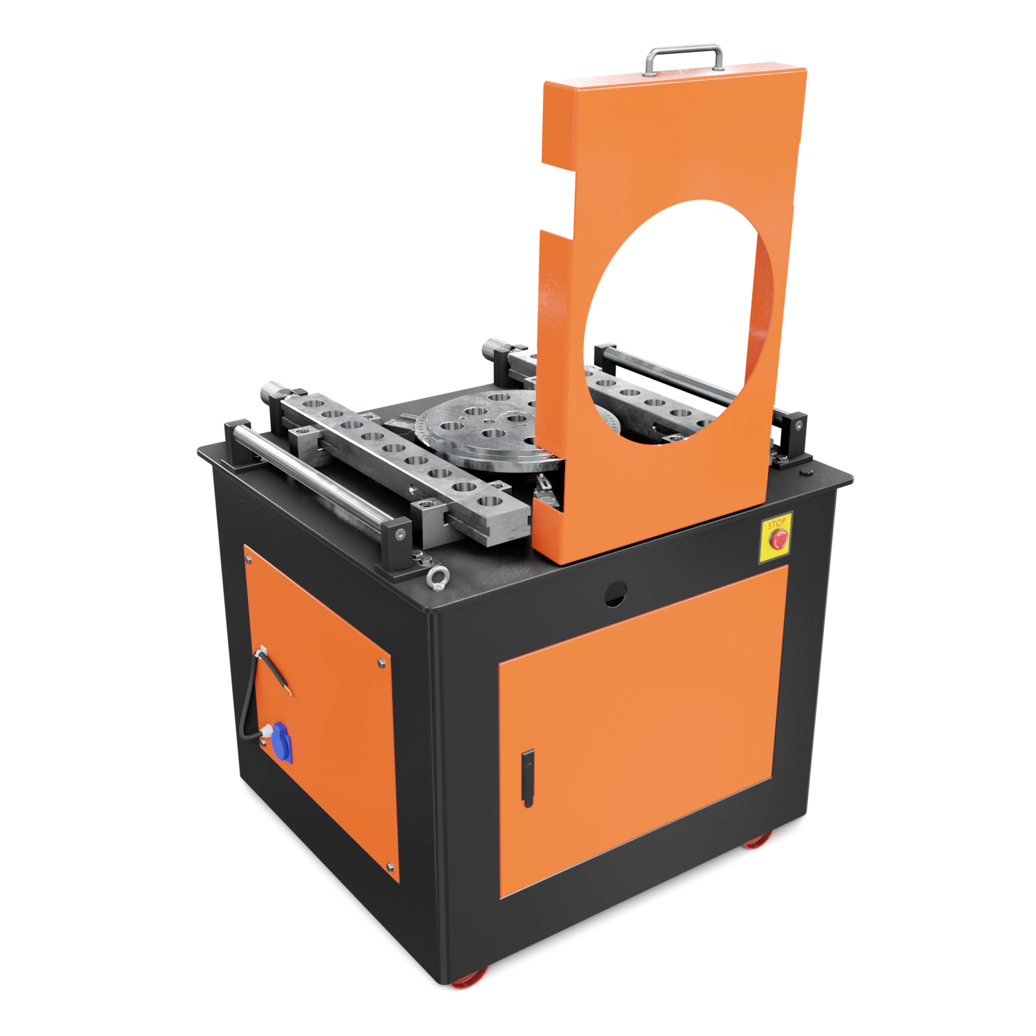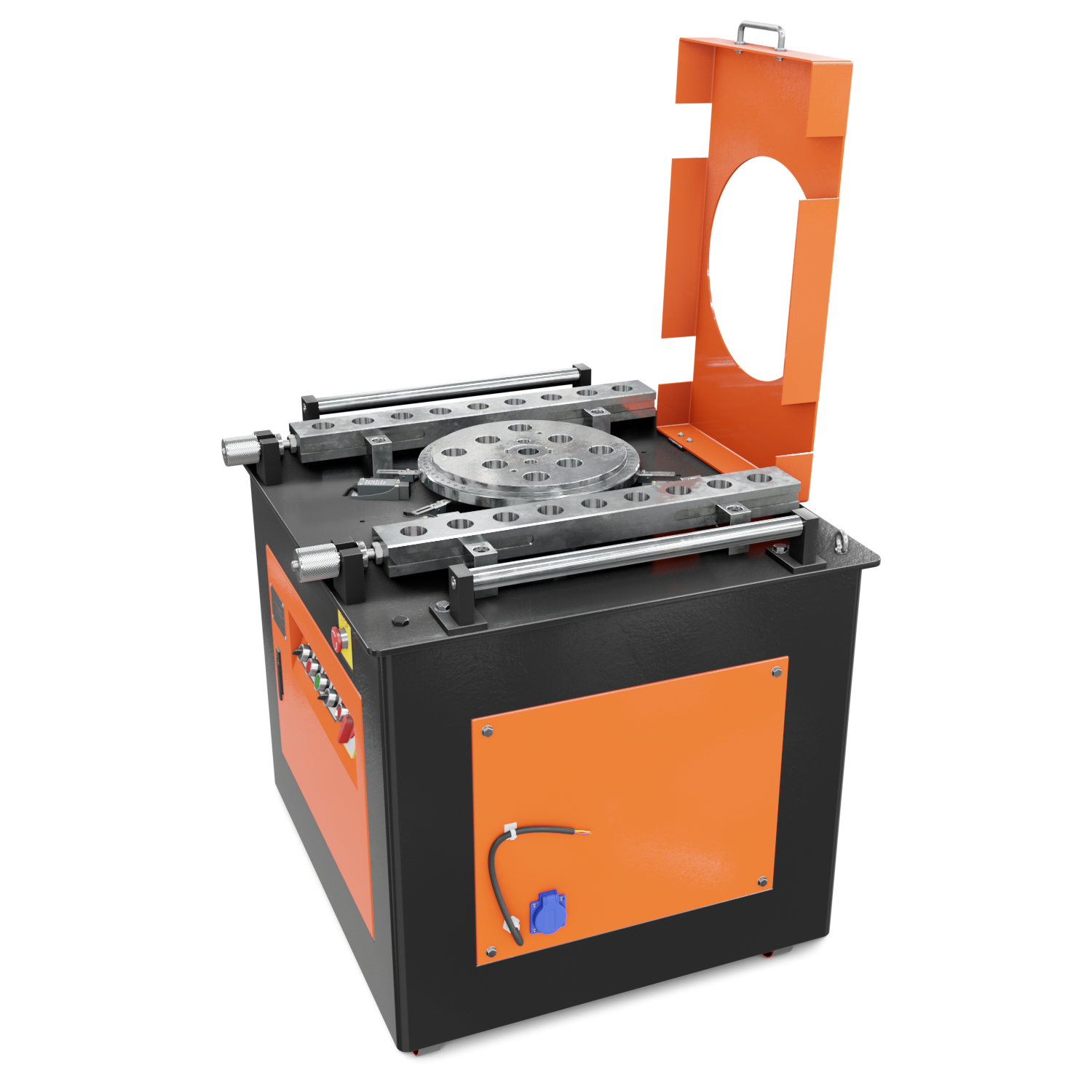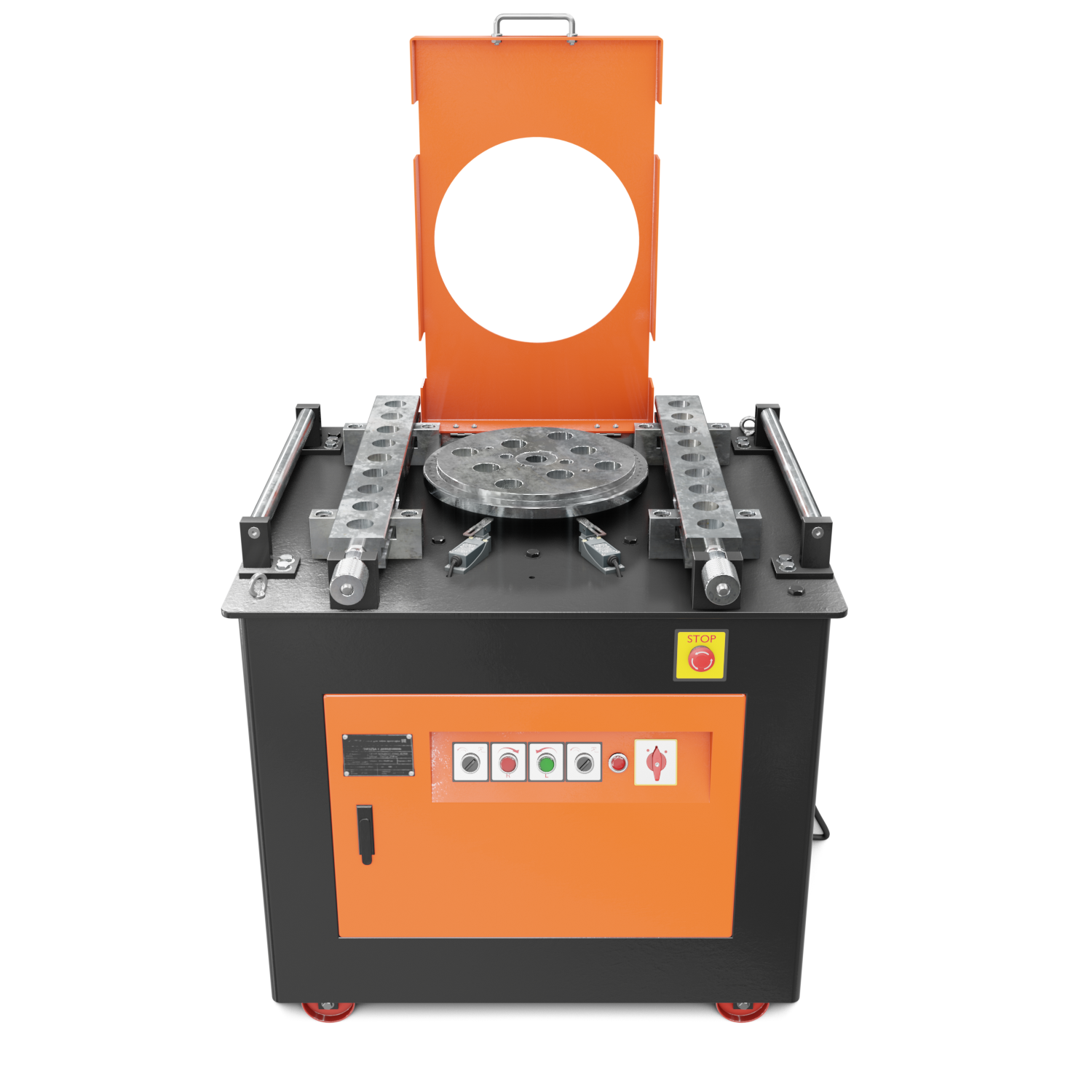 Заготовка из арматуры формируется от давления гибочных роликов, установленных на вращающейся планшайбе. Вы можете выбрать необходимые размеры гибочных приспособлений из комплекта станка.