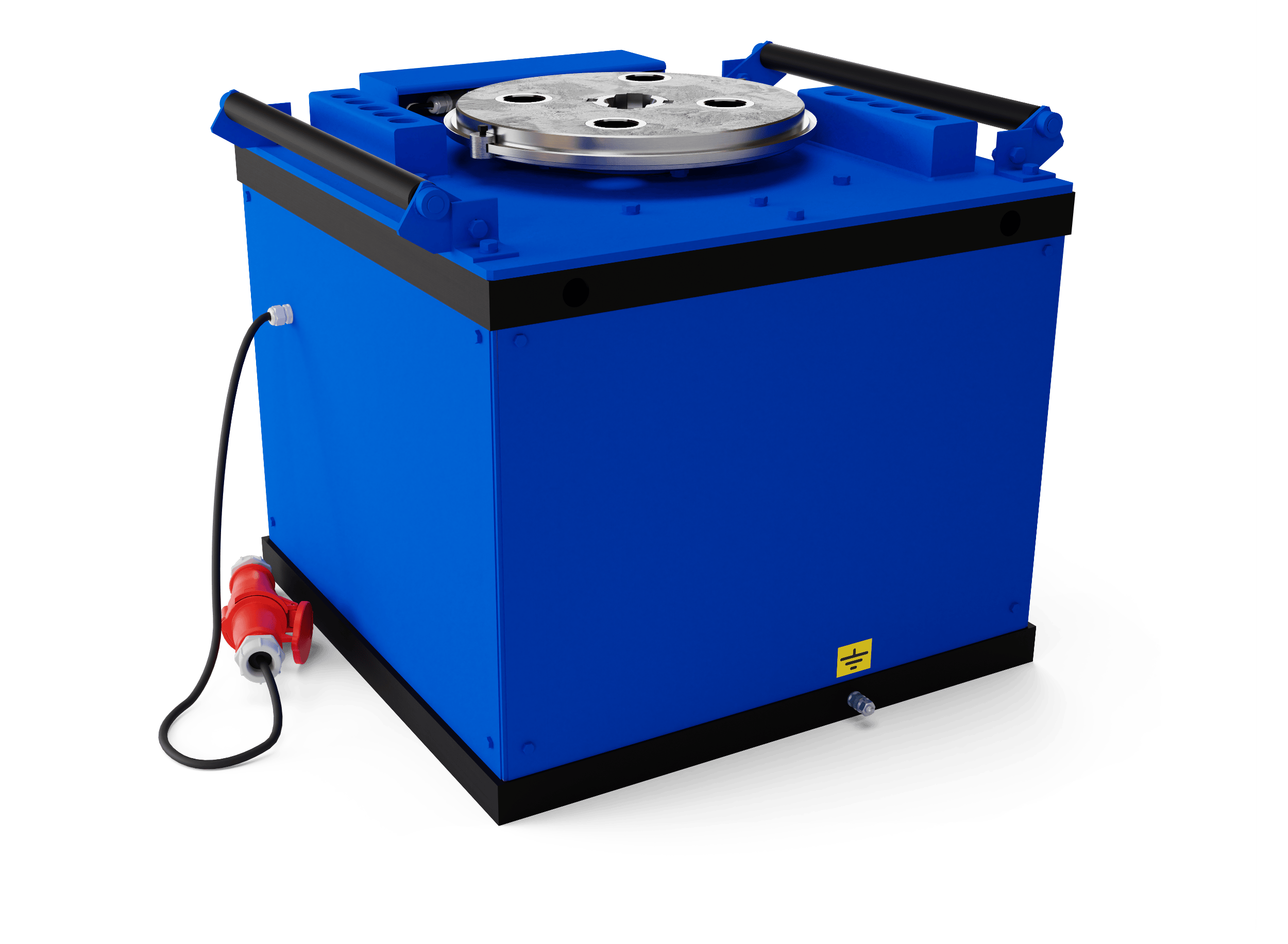 Плита служит крышкой редуктора и рабочим столом станка. К плите приварены квадратные планки с отверстиями под упорные штыри приспособления для гибки. На плите смонтированы рольганги и выключатель конечный для реверса и выключатель останова гибочного диска. Для удаления окалины на плите смонтирована воронка с фланцевым креплением для присоединения к цеховой вытяжной вентиляции.