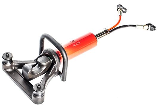 4.4. Проверьте работу арматурогиба на холостом ходу. Для этого переключите распределитель на гидравлической станции или насосе в положение «выдвижения штока». Создайте давление в гидросистеме либо кнопкой «ПУСК» на станции, либо рукояткой на насосе. После полного выдвижения штока, переключите распределитель на маслостанции в положение «возврат штока». После полного возврата штока, выключите насос. Если шток арматурогиба выдвигается и возвращается без рывков, значит, в системе нет воздуха и можно приступать к работе. Если шток перемещается с рывками, совершите еще несколько циклов выдвижение-возврат штока для удаления воздуха.