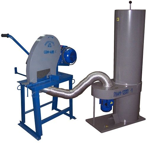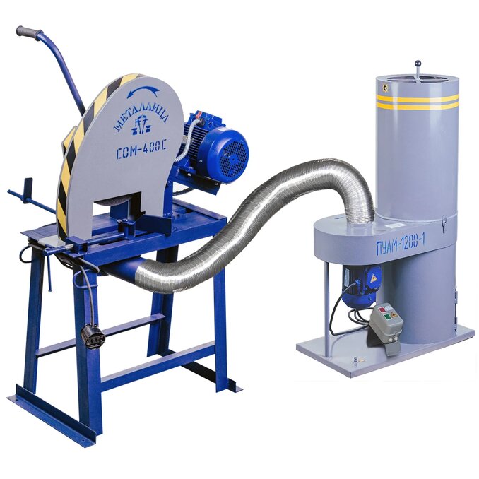 Защитные кожуха уменьшают разлетание искр во время работы отрезного станка СОМ-400С. Конструкция нижнего кожуха с патрубком позволяет подключить пылеулавливающий агрегат (ПУАМ) для фильтрации воздуха от абразивной пыли в рабочей зоне оператора.