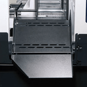 Раздающий лоток KL. Является продолжением стола станка и позволяет отрезанным заготовкам скатываться в контейнер, когда ведется обработка большой серии. Лоток состоит из 2-х частей, что исключает стекание СОЖ вне станка (заказывается дополнительно). |