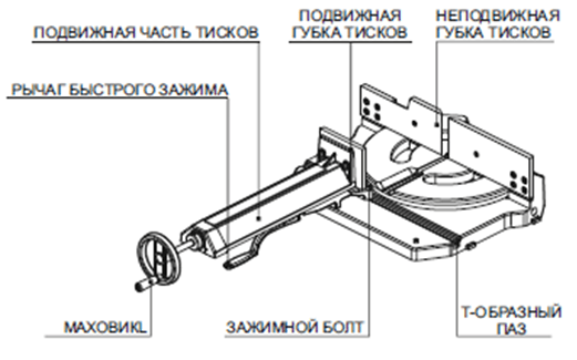 Универсальная конструкция зажимных тисков предусматривает возможность пиления заготовок под углом в диапазоне от -45⁰ до 60⁰.