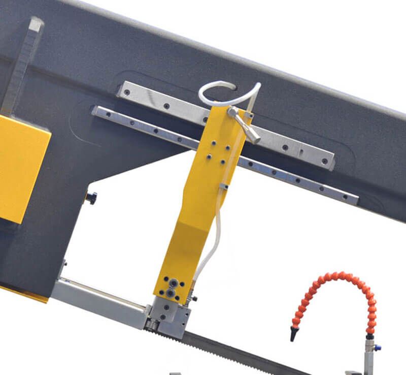 - Конструкция станка имеет отличительные особенности в зависимости от назначения модели (второй гидроцилиндр на опускание пильной рамы, гидравлический привод перемещения губок тисков в зависимости от положения пильной рамы, дополнительные вертикальные направляющие, автоматическая регулировка высоты подъёма пильной рамы, педаль оператора и др.).