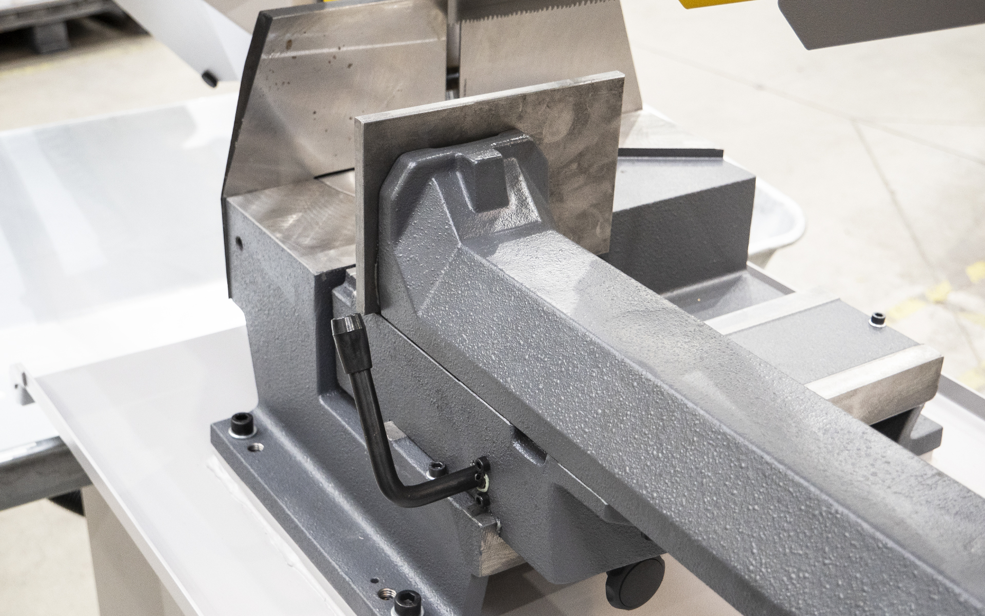 Фиксация заготовок осуществляется с помощью ручных тисков, регулируемых относительно установленного угла раскроя. Точное продольное положение обеспечивается направляющими «ласточкин хвост». Система первичной фиксации заготовок при помощи поворотного колеса дополнительно оборудована функцией быстрого перемещения с эргономично расположенным рычагом управления, расположенным со стороны тисков. Что позволяет менять поперечное положение подвижных губок тисков немедленно и независимо на поворотном кругу. Это может быть полезным и сэкономит время, особенно когда необходимо менять одну заготовку на другую с отличным диаметром/ шириной. Другая полезная функция, которая позволяет экономить время, быстрый зажим/ослабление тисков при помощи эксцентрика и подшипника. Что исключает необходимость смены положения тисков при помощи маховика при серийном раскрое.Пильное полотно