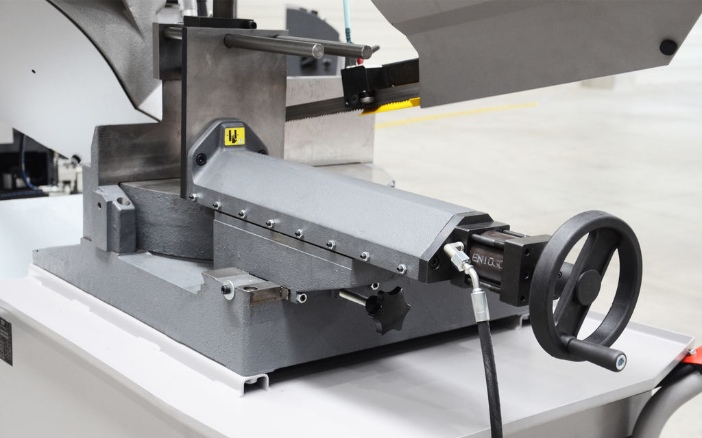 Фиксация заготовок осуществляется с помощью гидравлических тисков. Регулировка давления тисков и верхний гидравлический прижим (пакетная резка) поставляются опционально.Оснастка и система подачи-выгрузки