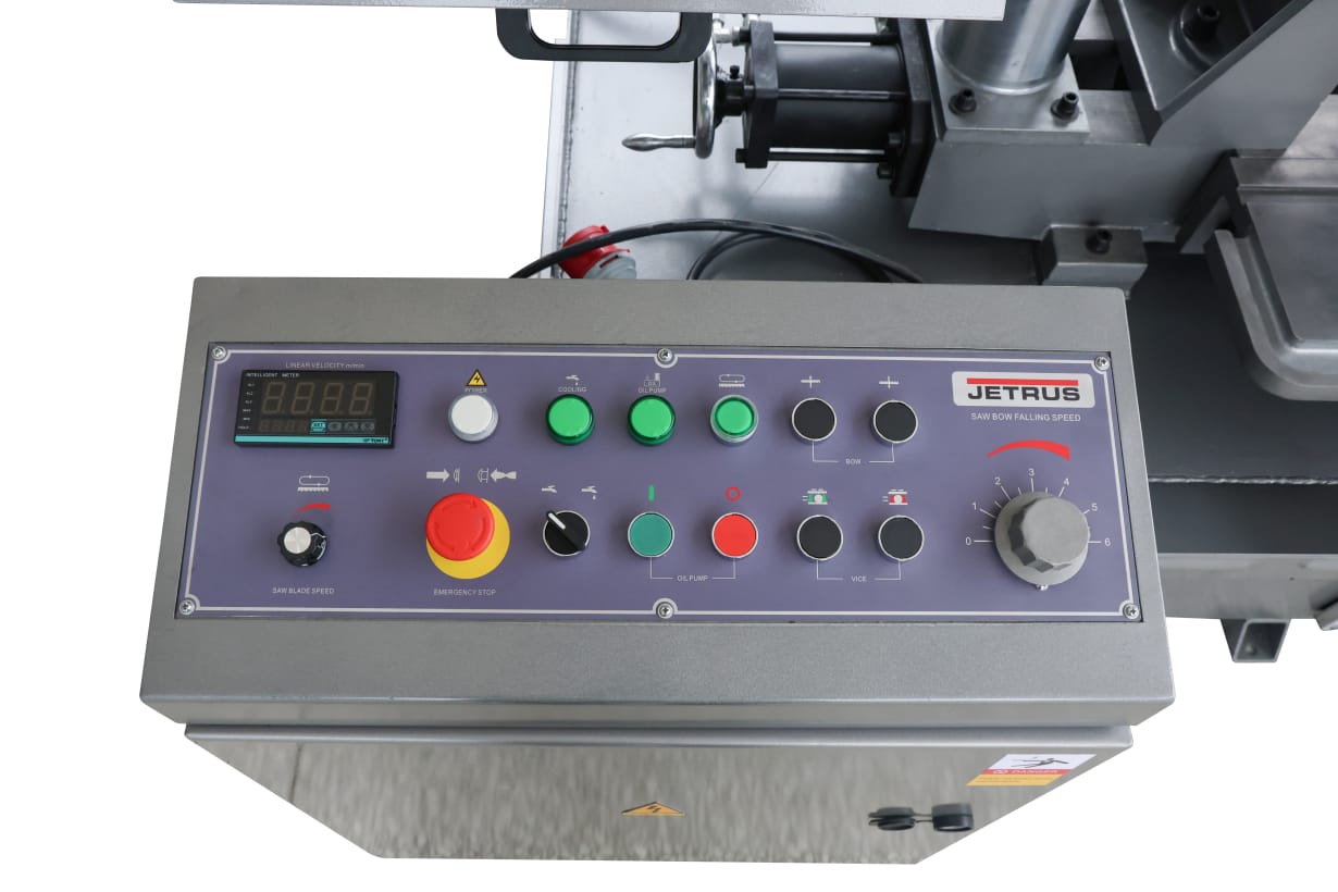 Скорость движения ленточного полотна плавно регулируется в пределах от 0 до 70 м/мин. Плавная регулировка скорости движения ленточного полотна позволяет подобрать нужный режим пиления и повысить качество производимой детали. Скорость устанавливается потенциометром на пульте управления и отображается на цифровом табло частотного преобразователя, который поддерживает необходимую скорость при изменении нагрузки.