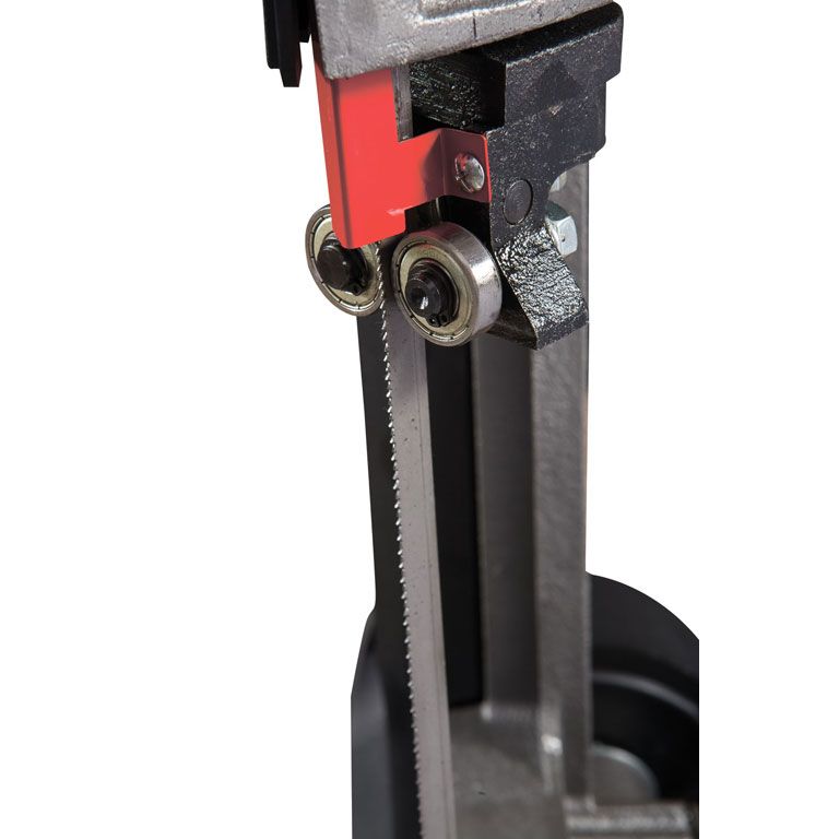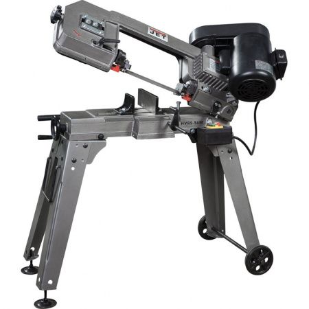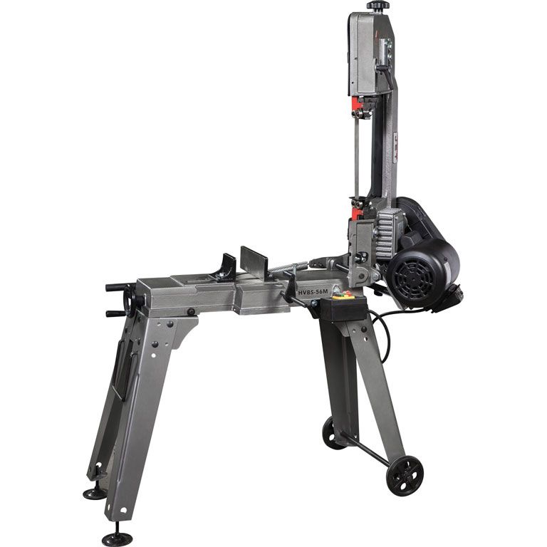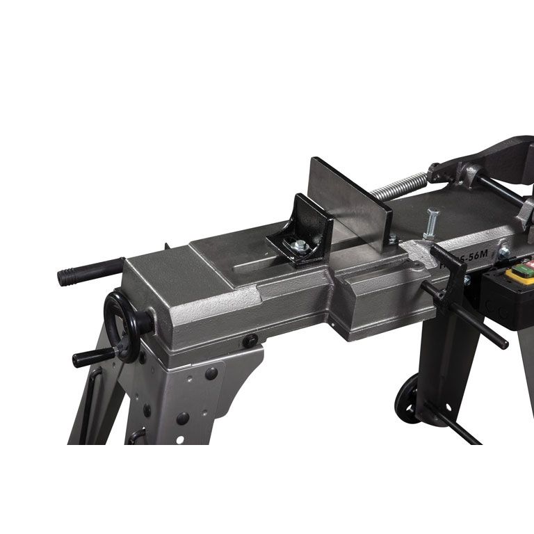 Модель HVBS-56М оснащена компактным электродвигателем мощностью 650 Вт. Станок имеет ременной привод, обеспечивающий движение ленточного полотна в 3-х скоростном режиме, 20,30 и 50 м/мин. Моторная группа имеет систему воздушного охлаждения. На раме установлены направляющие, регулирующие позиционирование полотна при пилении заготовок различного диаметра. Сокращение расстояния между направляющими уменьшает увод полотна, повышает качество распила. Необходимая точность распила достигается благодаря наличию в конструкции станка подшипников, установленных непосредственно в направляющих. Задача подшипников обеспечить постоянное перпендикулярное положение полотна по отношению к заготовке в процессе распила.