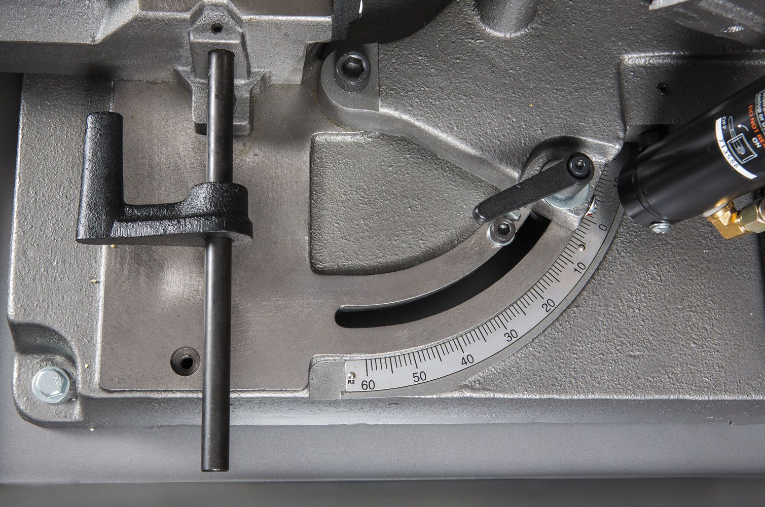 Модель имеет направляющие, передвижение которые по раме регулирует проход ленточного полотна и качество распила. С целью повышения точности распила, позиционирование полотна в вертикальном положении обеспечивается подшипниками, установленными в направляющих. Пиление заготовок требует использование СОЖ, подача, которой в зону резания осуществляется вручную. Модель имеет систему автоматической остановки двигателя, которая срабатывает по окончанию распила заготовки.