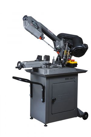 Модель MBS-56CS представляет собой ленточнопильный станок, рассчитанный на массовое серийное производство, используемый в домашних условиях для индивидуальной работы. Конструкция станка выполнена по европейскому типу, с поворотной рамой. Поворот рамы в нужное положение осуществляется при помощи шкалы, в диапазоне -45 0 – 60 0 . Для удобства работы в конструкции станка предусмотрено установка тисков в двух положениях. Основная особенность этой модели - наличие системы гидроразгрузки, обеспечивающей плавность и легкость опускания и подымания консоли. С помощью гидроцилиндра регулируется прижимное усилие пильной рамы, скорость подачи рамы на обрабатываемую заготовку. Модель предназначена для распила круглых заготовок максимальным диаметром 125 мм.