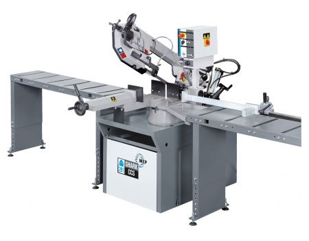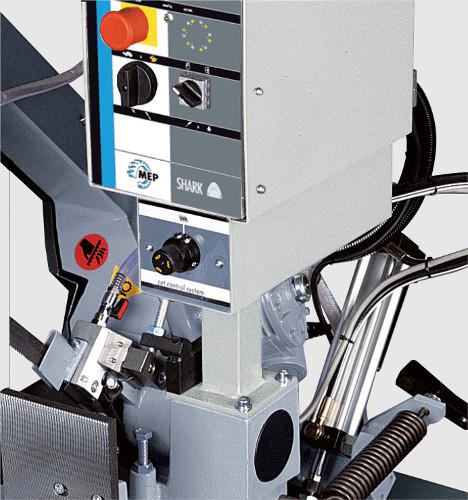 Ручной ленточнопильный станок модели SHARK 281 CCS (с системой управления распилом) для резки под углом от 0º до 60º слева. Наряду с работой в ручном режиме станок может выполнять отдельные проходы без помощи оператора за счёт использования массы пильной рамы, контролируемой гидравлическим тормозом: после осуществления распила полотно пилы останавливается. Рама вручную поднимается в положение, подходящее для перемещения прутка. В исполнениях с пневматическими тисками (модели MA) тиски зажимаются и разжимаются посредством клапана с ручным управлением (или посредством ножной педали, доступной по дополнительному заказу).