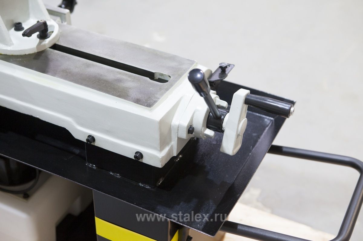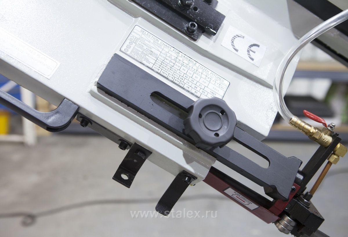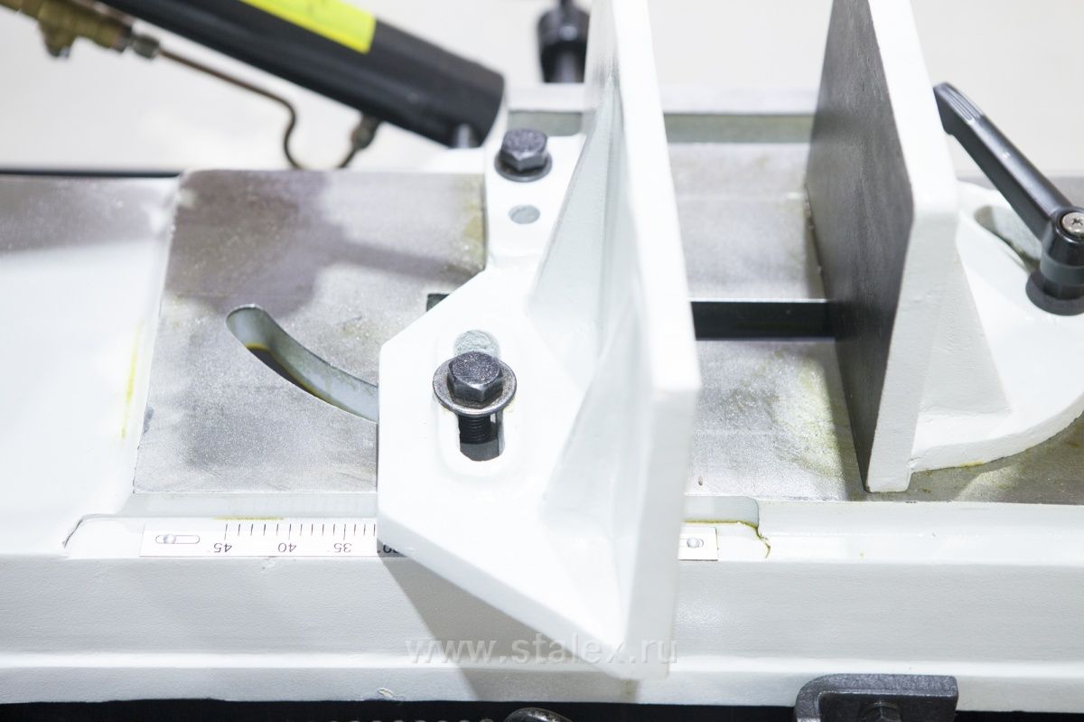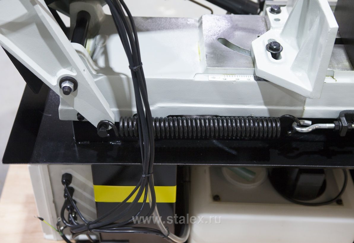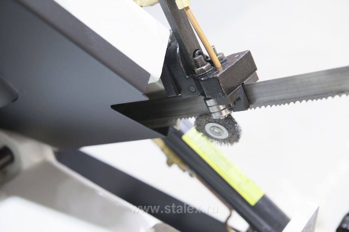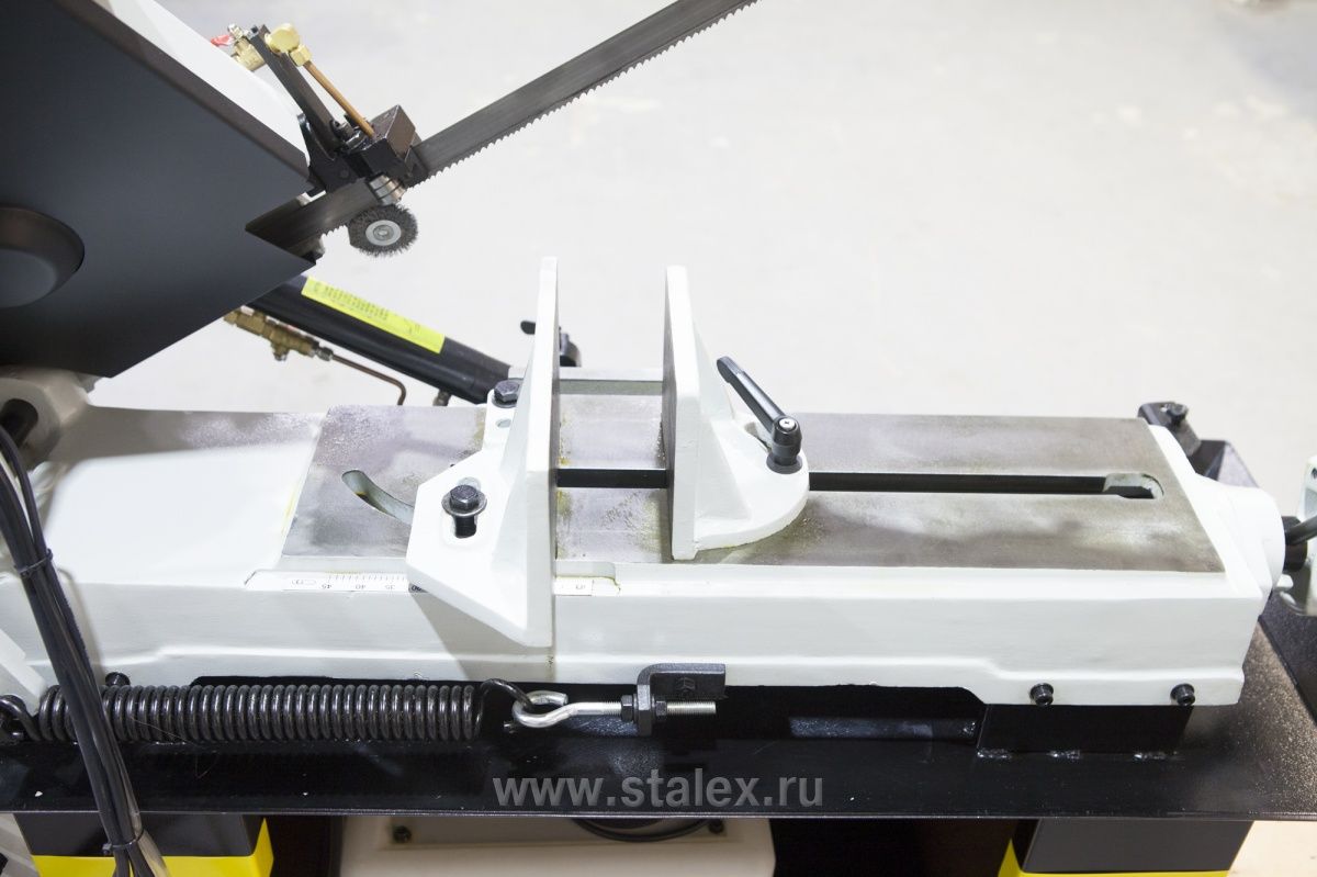 Станок Stalex BS-912B имеет поворот губок тисков, для пиления под углом необходимо изменять угол установки тисков. Зажим заготовки осуществляется тисками вручную, подача заготовки - также вручную. Мобильность станков позволяет использовать их на производстве непосредственно там, где это необходимо. Станки находят широкое применение в серийном и мелкосерийном производстве. Система СОЖ в стандартной комплектации, регулировка скорости осуществляется с помощью ступенчатого шкива (4 режима скорости).