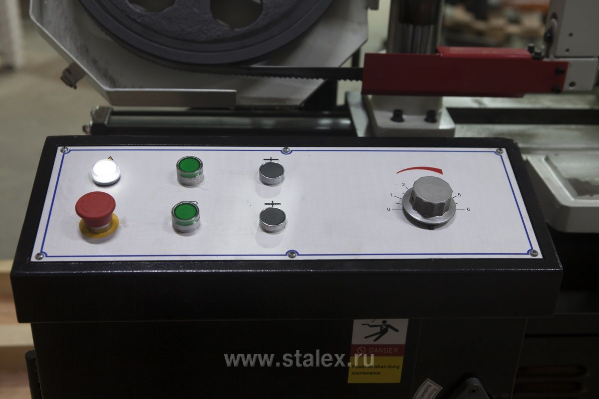 Пульт станка: Кнопка СТОП Индикация включения станка Кнопка «запуска вращения полотна» Кнопка «включения гидростанции» Кнопка «движение рамы вверх» Кнопка «движение рамы вниз» Маховик регулировки опускания рамы |