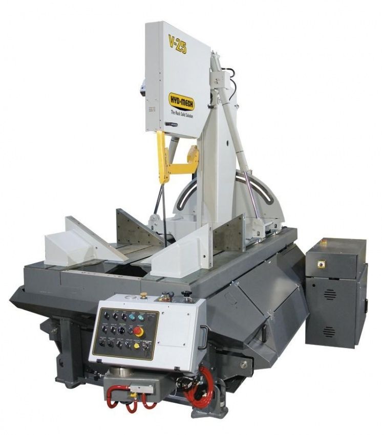 Гидравлическая система - давление в гидравлической системе нагнетается насосом с двигателем мощностью 2,2 кВт. Управление тисками, поворотом, подводом и отводом пильной рамы, натяжением режущего полотна и перемещением кронштейна для направляющей осуществляется посредством двух- (2) и трехпозиционных (3) распределителей. Доступ к насосу, двигателю и гидравлическому коллектору с распределителями осуществляется достаточно легко путем открытия дверцы для технического обслуживания гидравлического узла.
