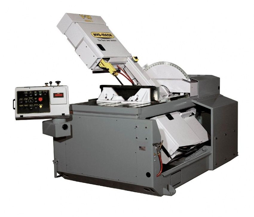 Гидравлическая система – давление в гидравлической системе нагнетается насосом с двигателем мощностью 1,5 кВт. За счет усилия, возникающего при подаче под давлением гидравлической жидкости, поток которой распределяется с помощью трехпозиционных распределителей, осуществляются такие операции как: управление тисками, поворот пильной рамы, подвод/отвод пильной рамы, регулировка натяжения режущего полотна, а также перемещение кронштейна для направляющей. Доступ к насосу, двигателю и гидравлическому коллектору с распределителями осуществляется достаточно легко путем открытия дверцы для технического обслуживания гидравлического узла, что позволяет максимально сократить длительность простоя.