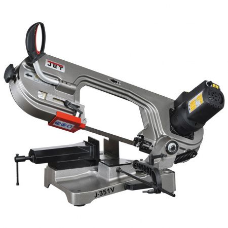 Модель JET 351V представляет ленточнопильный станок европейского типа, предназначенный для работы в домашних условиях, для мелкосерийных работ на производстве. Управление опусканием пильной рамы осуществляется в ручном режиме. Литая пильная рама обеспечивает необходимый прижим ленточного полотна к заготовке в процессе обработки. Поднятие рамы по окончанию работы выполняется оператором. Для этой цели рама снабжена пружиной, компенсирующей и облегчающей подъемное усилие. Станок рассчитан на распил круглых заготовок максимальным диаметром до 170 мм. Для достижения необходимого угла распила имеется шкала, фиксирующая поворот рамы на угол в диапазоне 0-60 0.
