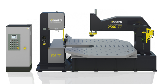 Специализированный автоматический вертикальный ленточнопильный станок 600-2500TT, для вырезания колец (кругов) из квадратных заготовок. Данная уникальная конструкция позволяет делать как внешний, так и внутренний рез в заготовке. Рабочий стол оборудован шариковыми опорами, для облегченного перемещения заготовок большой массы. Все узлы приводятся в движение при помощи серводвигателя. Станок оснащен сверлильной установкой для сверления отверстий, для дальнейшего внутреннего реза в заготовке. Станок оборудован сварочным аппаратом для варки ленточных пил.