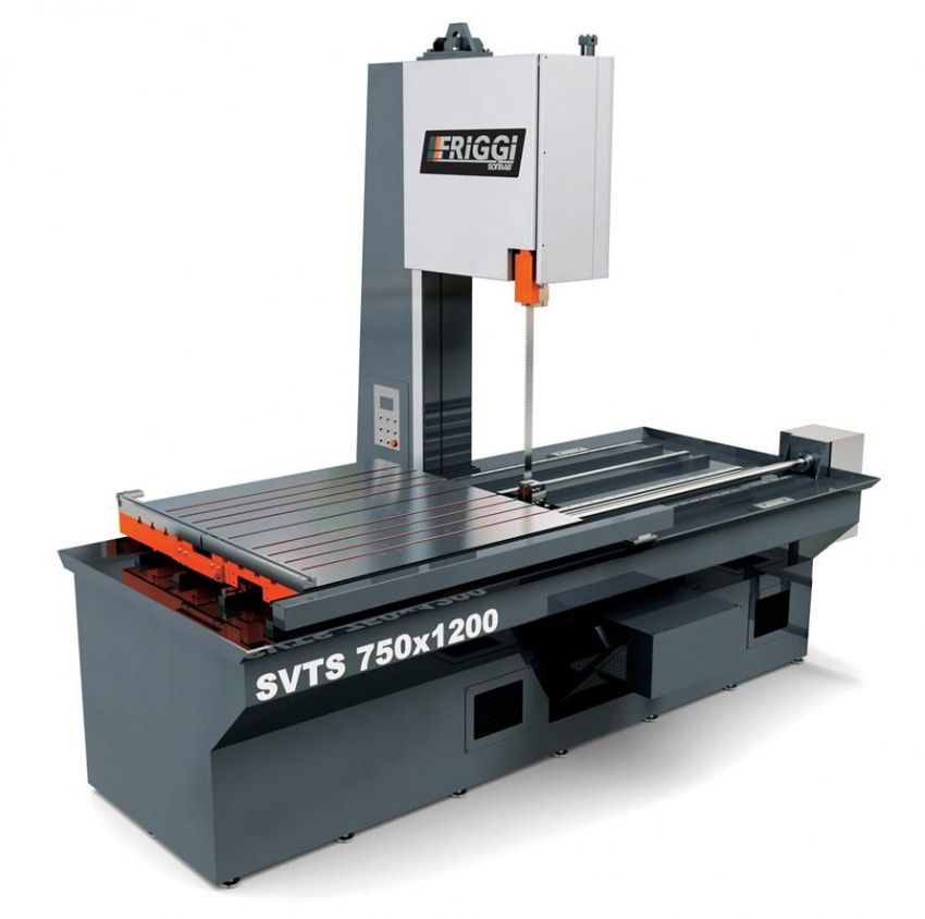 Friggi Soitaab SV TS — полуавтоматический вертикальный ленточнопильный станок с подвижным столом для распиловки различных видов заготовок, в том числе труднообрабатываемых. Материал подается в зону реза с помощью движущегося стола по четырем направляющим. Движение стола обеспечивается ШВП и бесщеточным двигателем. На столе расположены Т-образные пазы для крепления различных заготовок в том числе и нестандартных. Основным преимуществом данного станка является мощность его конструкции, это позволяет обеспечить оптимальную производительность при использовании как биметаллических, так и твердосплавных пил.