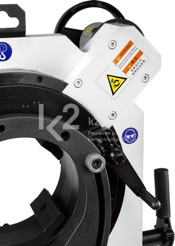 Вращение вокруг оси выполняется вручную вращением маховика, который расположен со стороны зажимных кулачков и позволяет оператору не находится в зоне обработки. Серия труборезов серии OSK аналогична OSE но снабжена приводом подачи- мотором который осуществляет вращение основного привода вокруг оси.