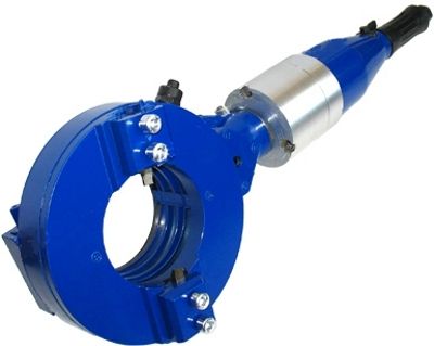 Простой и удобный труборез. Не требует долгой настройки и сборки. Возможность поворота привода в любую сторону для удобства в работе. Фиксация на трубе. Самоцентрирующийся механизм зажима трубы. Плавная автоматическая подача резцов. Пневматический двигатель.
