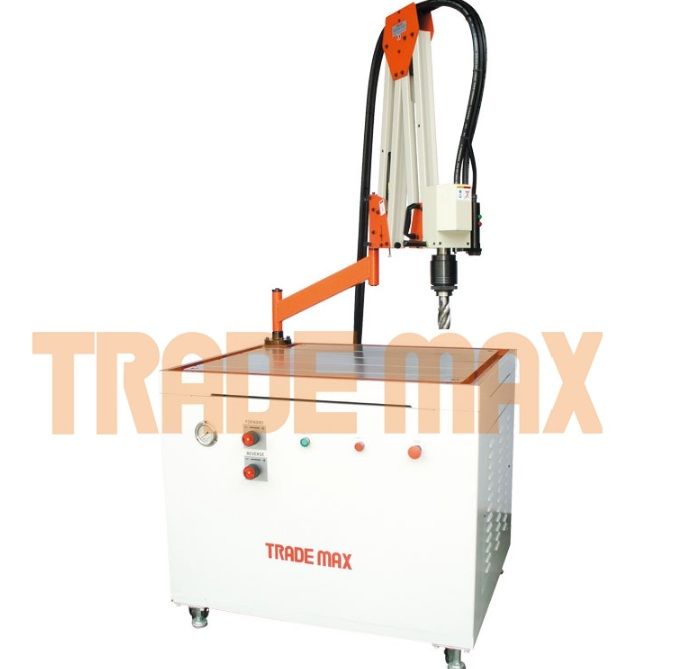 Резьбонарезной манипулятор электрический. Подходят для цехов, где нет сжатого воздуха и присутствует необходимость нарезки резьбы большого диаметра, вплоть до М60. Также к достоинствам, можно отнести полностью программируемые параметры нарезания резьбы, включая скорость прямого и обратного вращения, шаг резьбы и глубину, что сравнимо по качеству и функционалу с нарезкой резьбы ЧПУ станками.