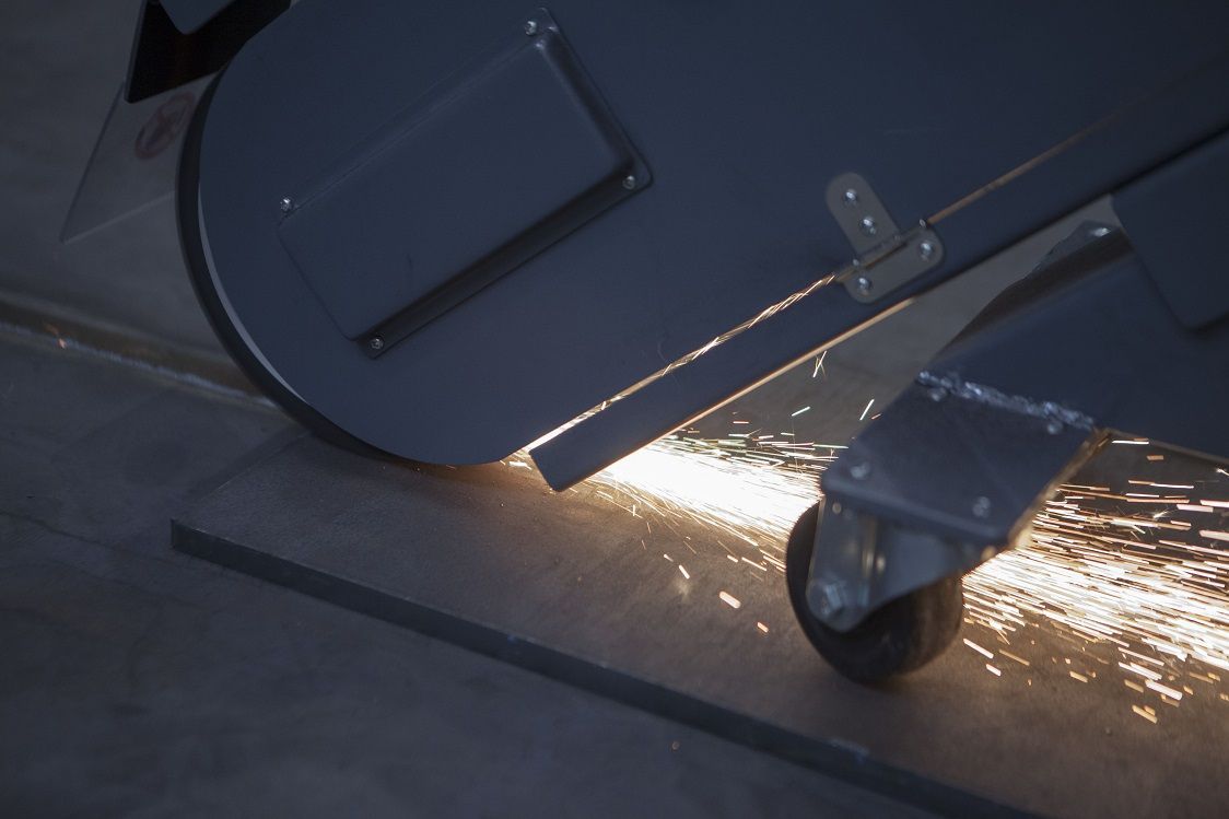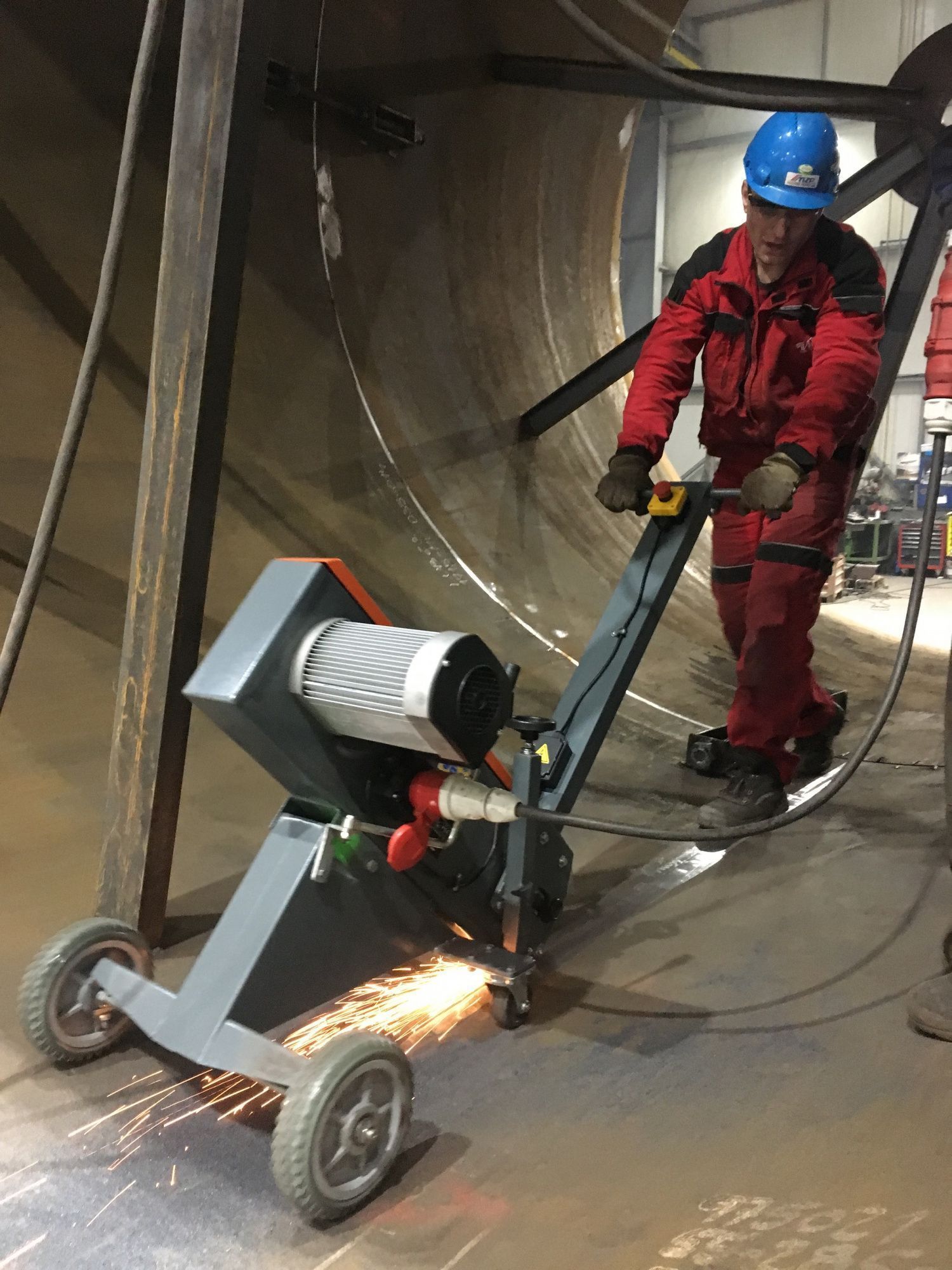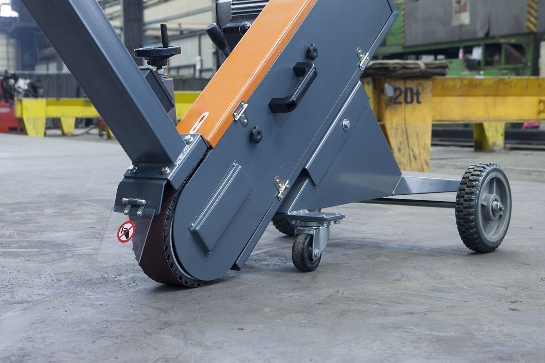 Мобильный шлифовальный станок для проведения работ на месте на полу: шлифования напольных сварных швов; удаления окалины и лишних слоев, образованных в процессе прокатки листа, резки металла кислородной или плазменной резкой.