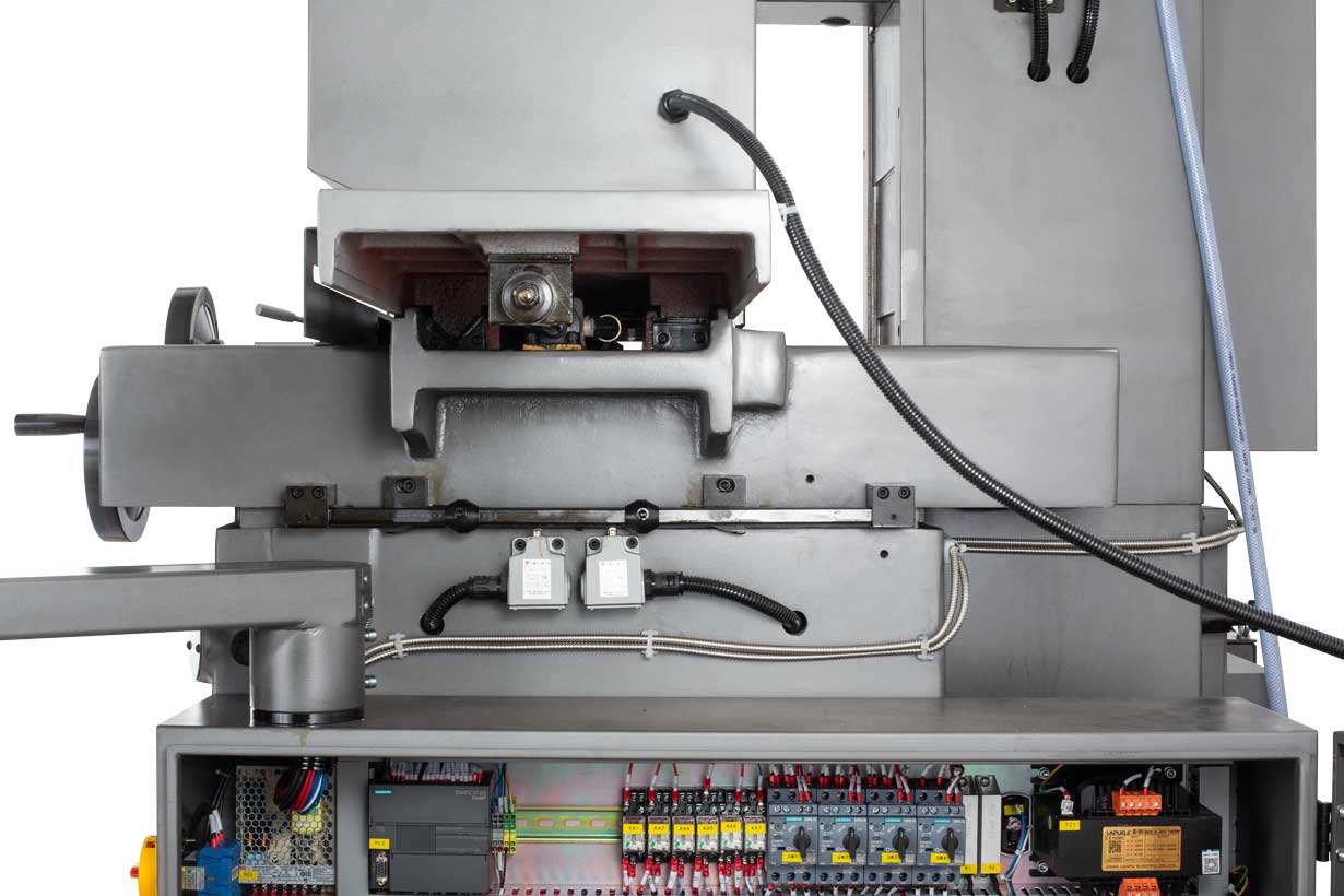 Продольное и поперечное перемещение стола выполняется в автоматическом режиме. Вертикальное перемещение шлифовального круга осуществляется вручную или в автоматическом режиме. За вращение шпинделя отвечает главный двигатель мощностью 2200 Вт. Мощность двигателя гидростанции 750Вт, объем гидравлической системы – 60 литров. Мощность насоса подачи СОЖ 40Вт. Объем бака СОЖ 50 л.