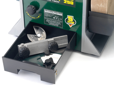 Шлифовальные круги надежно крепятся на валу из нержавеющей стали. Это позволяет избежать появления ржавчины. Точение и шлифовка происходят во влажной среде, поэтому данная особенность выгодно отличает станок Record Power от конкурентов.
