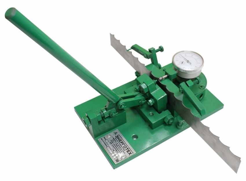Разводной станок позволяет производить развод зубьев ленточных пил. Величина развода контролируется по стрелочному индикатору, входящему в комплект станка.