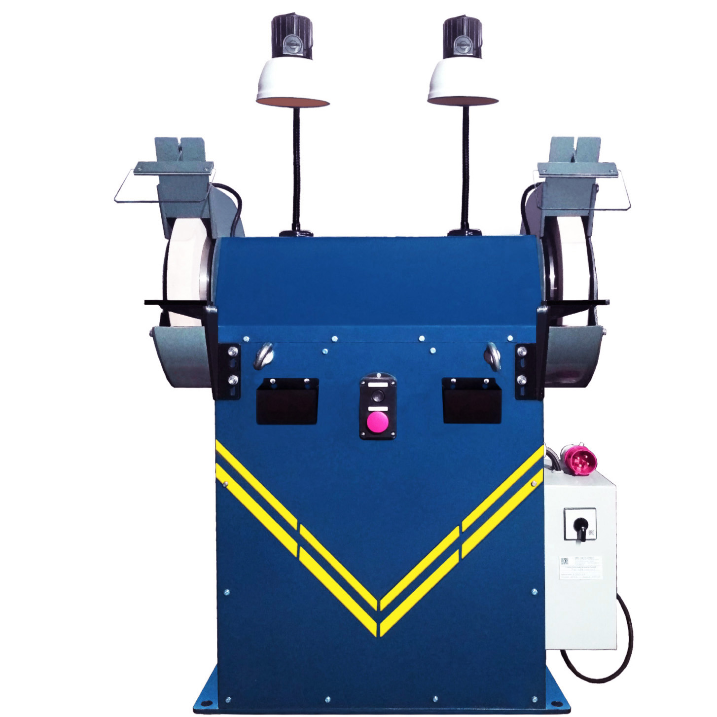 На станок установлен концевой выключатель для блокировки двигателя при поднятии защитного экрана. Регулировка упоров по горизонтали и вертикали обеспечивает удобную работу на станке. Установлены съемные металлические ёмкости для охлаждающей жидкости. Защитные кожуха имеют выходные вентиляционные патрубки для подключения пылеотсосов, позволяющих фильтровать воздух от абразивной пыли в рабочей зоне оператора.