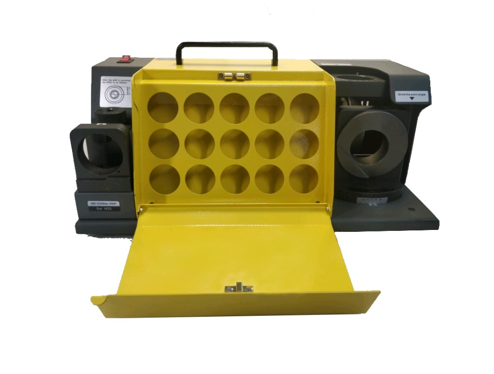 Станок состоит из корпуса и отверстий под свёрла. В нём есть электродвигатель и рабочий элемент - эльборовый диск. В комплекте есть набор цанг (или одна, но регулируемая под разные диаметры), позволяющих подать свёрла под нужными углами. Кроме того, станок оснащён поддоном для абразива и стружки.