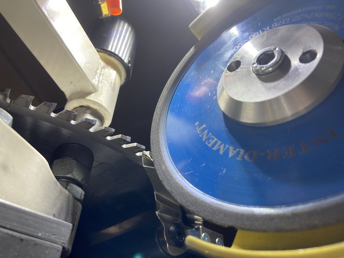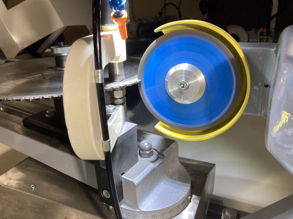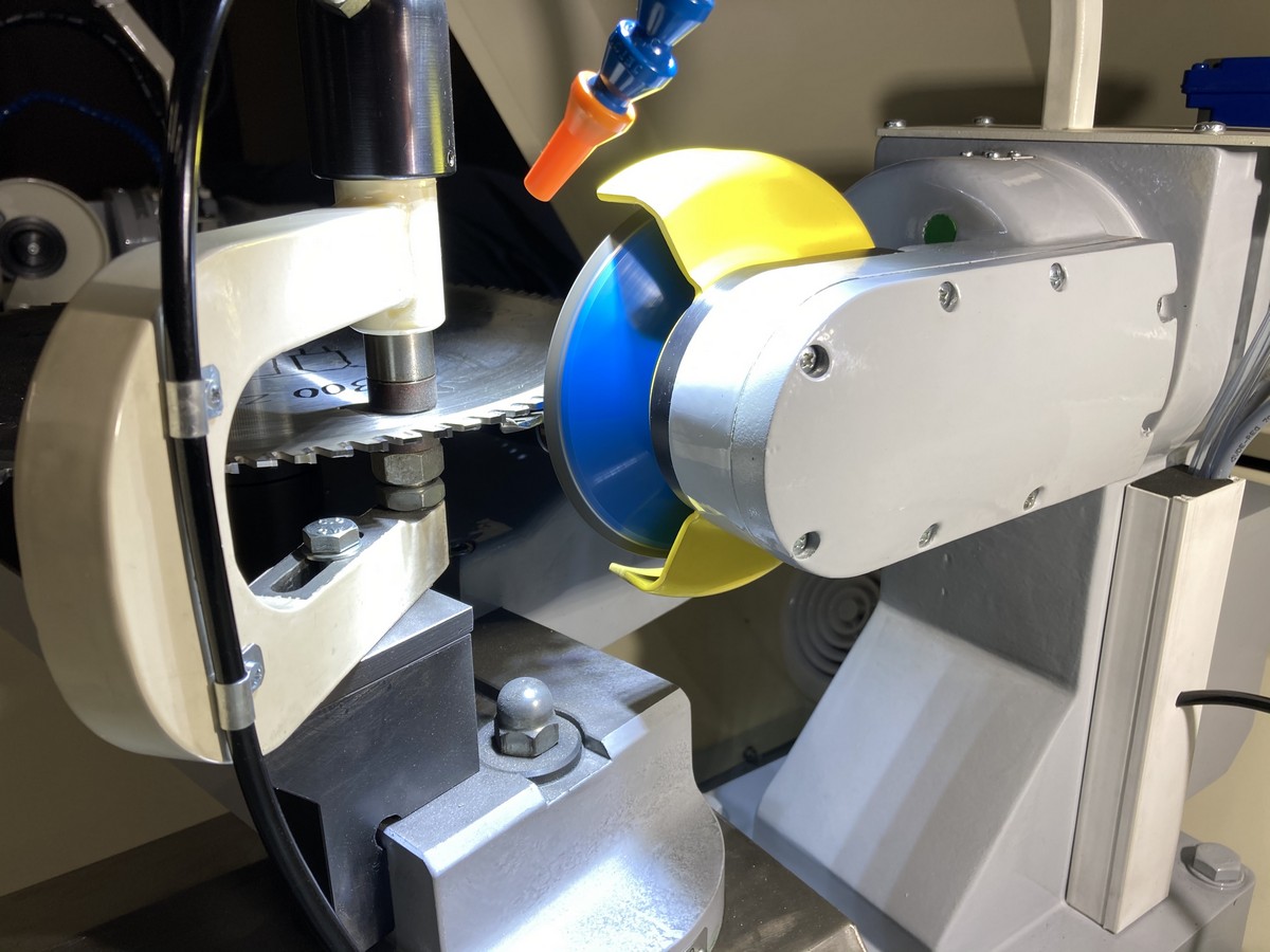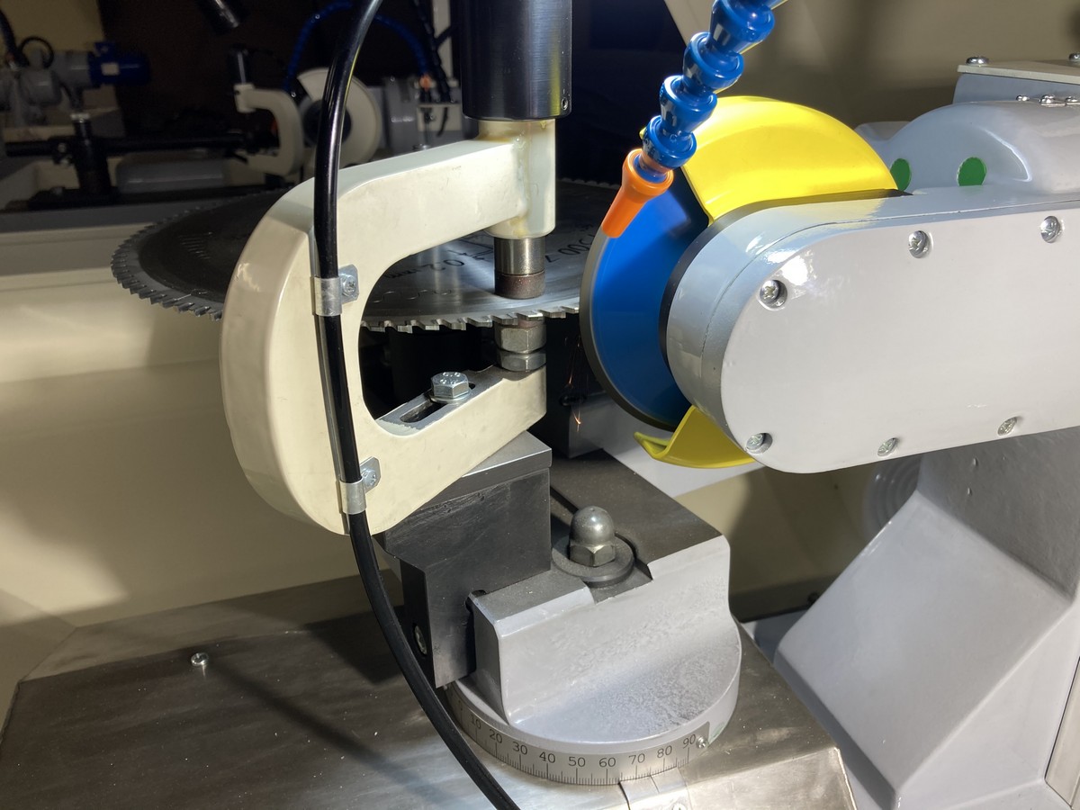 Заточка передней и задней поверхностей зуба происходит без снятия пилы что повышает производительность станка. Заточка задней поверхности зуба в форме трапеции происходит в один прием, заточная головка поворачивается на заданный угол, а задняя поверхность автоматически занижается на установленную высоту (например на 0,2мм).