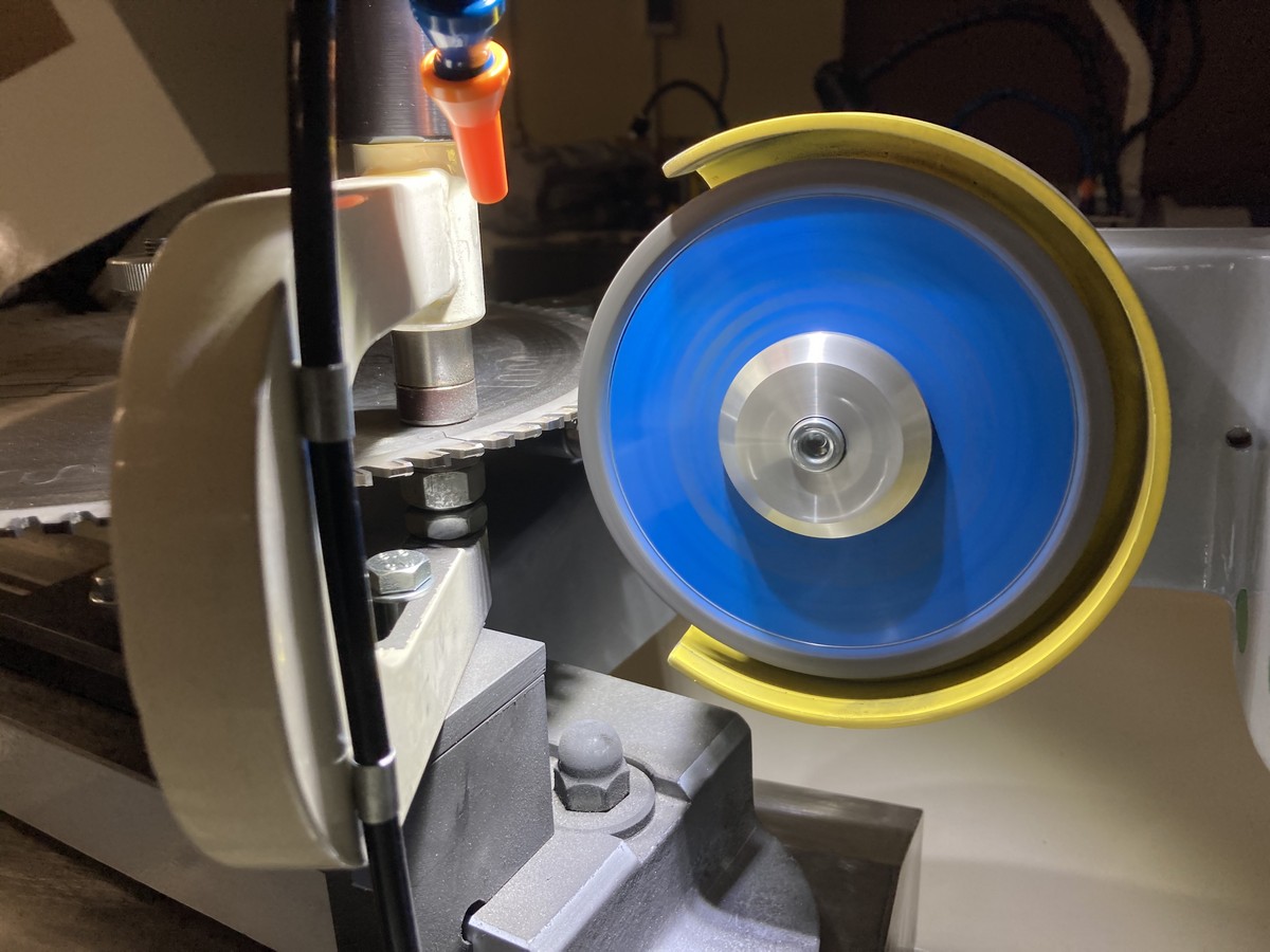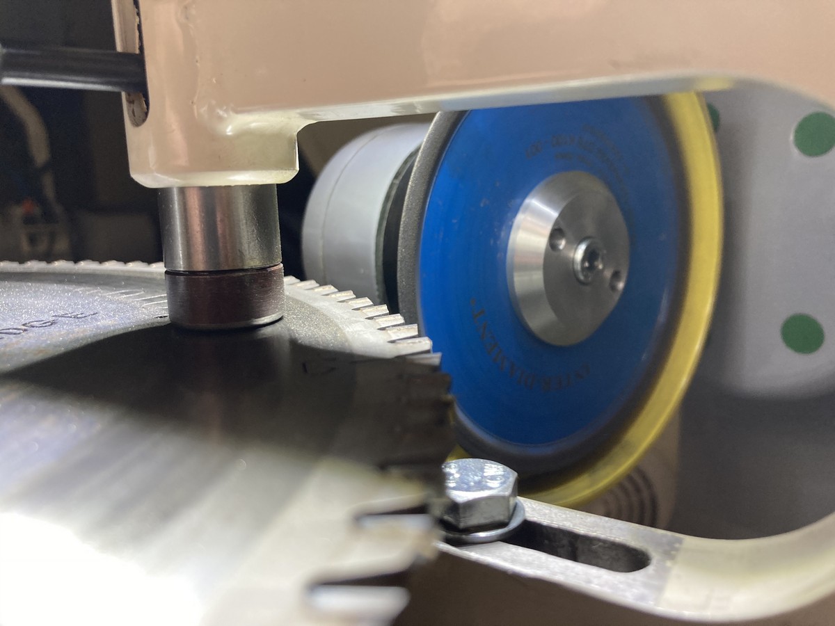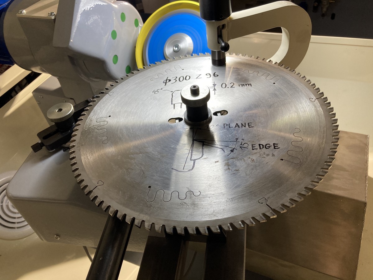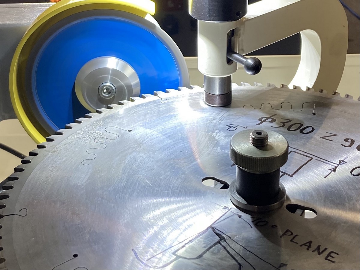 Заточка передней и задней поверхностей зуба происходит без снятия пилы что повышает производительность станка. Заточка задней поверхности зуба в форме трапеции происходит в один прием, заточная головка поворачивается на заданный угол, а задняя поверхность автоматически занижается на установленную высоту (например на 0,2мм).