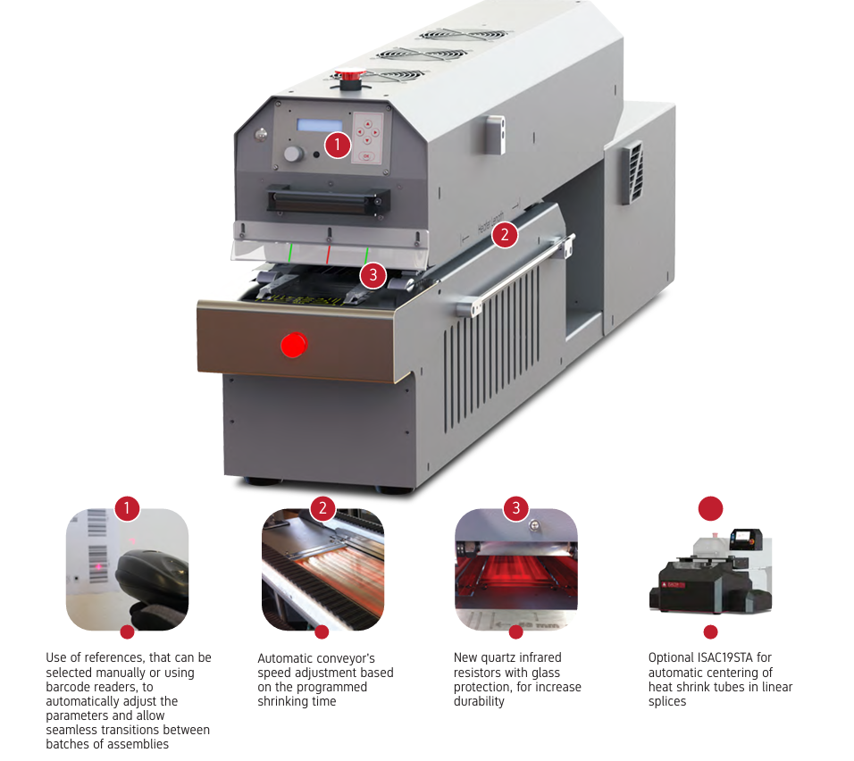 Система термоусадки STCS-CS19 выполнена в виде конвейера на основе инфракрасных резисторов. Она имеет несколько режимов работы, включая использование эталонных значений, выбор которых осуществляется с помощью считывателей штрихкодов.