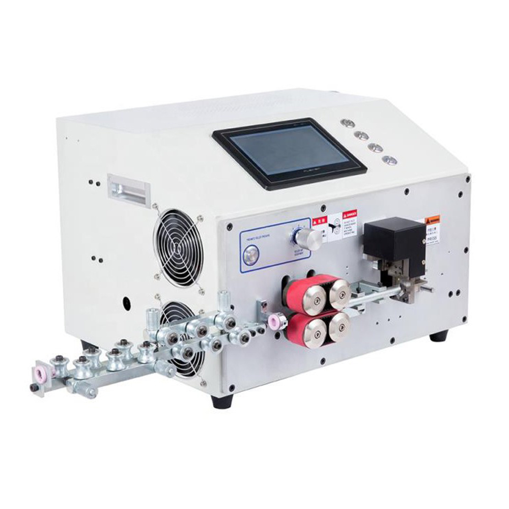 Станок для резки и зачистки провода DY-1220C выполнен в виде настольного металлического короба, внутри которого действует два вентилятора, эффективно охлаждающих аппаратуру и приводы. При втягивании провод выравнивается. Само втягивание выполняется с помощью двух пар валиков с натянутыми ремнями (это точная и плавная подача); зазор между ними регулируется. Перед лезвием кабель позиционируется трубчатой направляющей. Автомат управляется через сенсорный экран – касаниями именно в экране (аналогично принципу бытового планшета). Все настройки выполняются в интуитивно понятном интерфейсе.