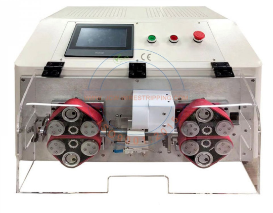 Машина для резки и зачистки кабеля JCW-CS07 использует 7-осевую карту управления движением для точного управления роликами, расстояние между роликами и давление регулируются с помощью 7-дюймового цветного сенсорного экрана. Верхние и нижние ролики перемещаются одновременно, независимо от того, какой кабель большой или небольшой, центральные точки троса всегда параллельны направляющей трубке и режущему лезвию.