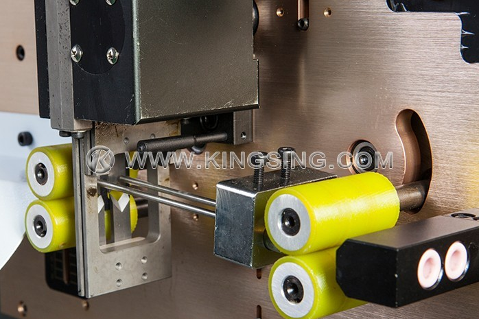 - Отличительной особенностью станка автоматической разделки провода KS-W112 является улучшенный механизм подачи и позиционирования проводника, что позволяет выполнять ультракороткие зачистки.