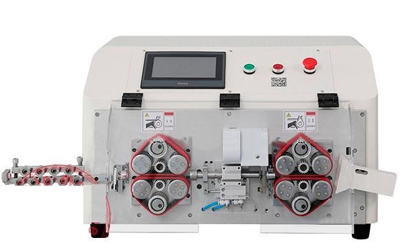 Автоматический станок для резки и зачистки проводов KS-W630 – это программируемая посредством интуитивно понятного интерфейса машина с сервоприводами, которой для начала работы требуется только электричество и компрессор (опция). Задача – снятие общей внешней изоляционной оболочки с многожильных кабелей. Втягивание материала выполняется двумя ременными парами, зазор между которыми регулируется также на компьютере. Ремни имеют такое покрытие, которое не может повредить структуру проводника. Есть кнопка аварийного выключения питания. Зона резки отделена прозрачным щитом.