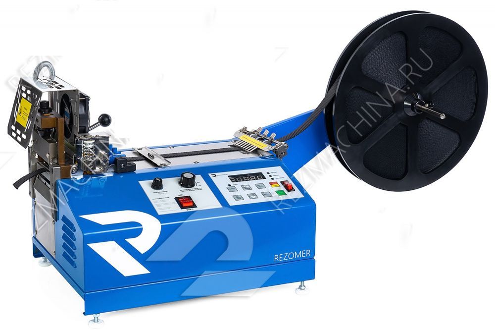 Фирменный станок REZOMER® для резки синтетических материалов горячим способом. Автомат продвигает материал на заданную длину и осуществляет рез горячим ножом за счет удара об ответную платформу.