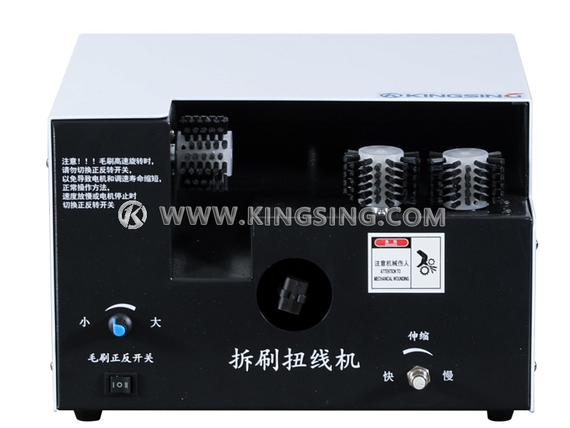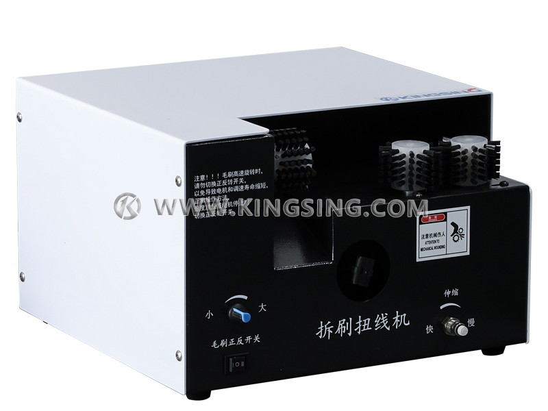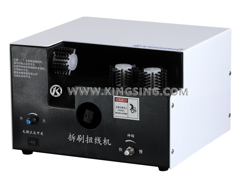 Станок для скручивания провода KS-W02 – это настольная электромеханическая машина, удобная для работ с проводами, у которых внутренняя часть состоит из нескольких жил и покрыта сверху экранирующей оплеткой. Для снятия (расслоения и отделения от сердцевины) оплетки установлено три щетки – одиночная и две в рабочей паре, которые используются в зависимости от ситуации. Для скручивания используется инструмент в виде микро тисков на вращающемся основании. Скорость вращения щеток регулируется, чтобы не повредить оплетку. Общая конструкция имеет вид короба на резиновых ножках.
