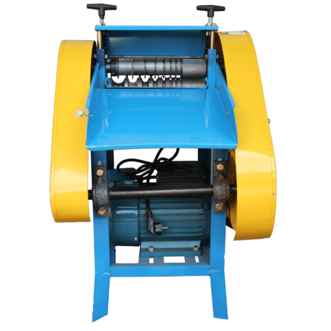 Данный станок для переработки кабеля имеет 2 вала (одну пару), которые вращаются за счёт ременной передачи от двигателя - нижний вал (с местами под кабель конусообразной формы) протягивает кабель, а ножи на верхнем вале разрезают кабель. Вал с ножами разборный из ножей и проставок. Ножи одинаковые.