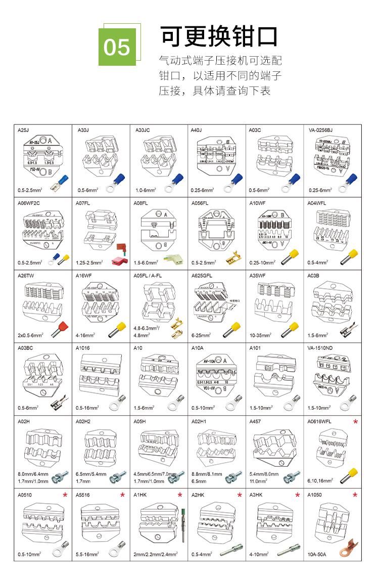 Пресс KS-5C v.2 может быть укомплектован тремя типами матриц, для работы с сечениями 0,25-25 мм кв, 35-85 мм кв и 85-120 мм кв. Учитывая простоту замены обжимных матриц и усилие опрессовки в 2,5 тонны, данное решение позволяет сформировать максимально гибкий производственный участок.