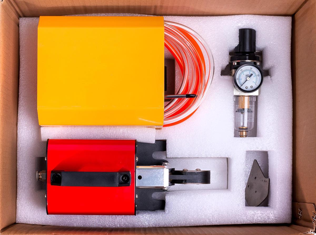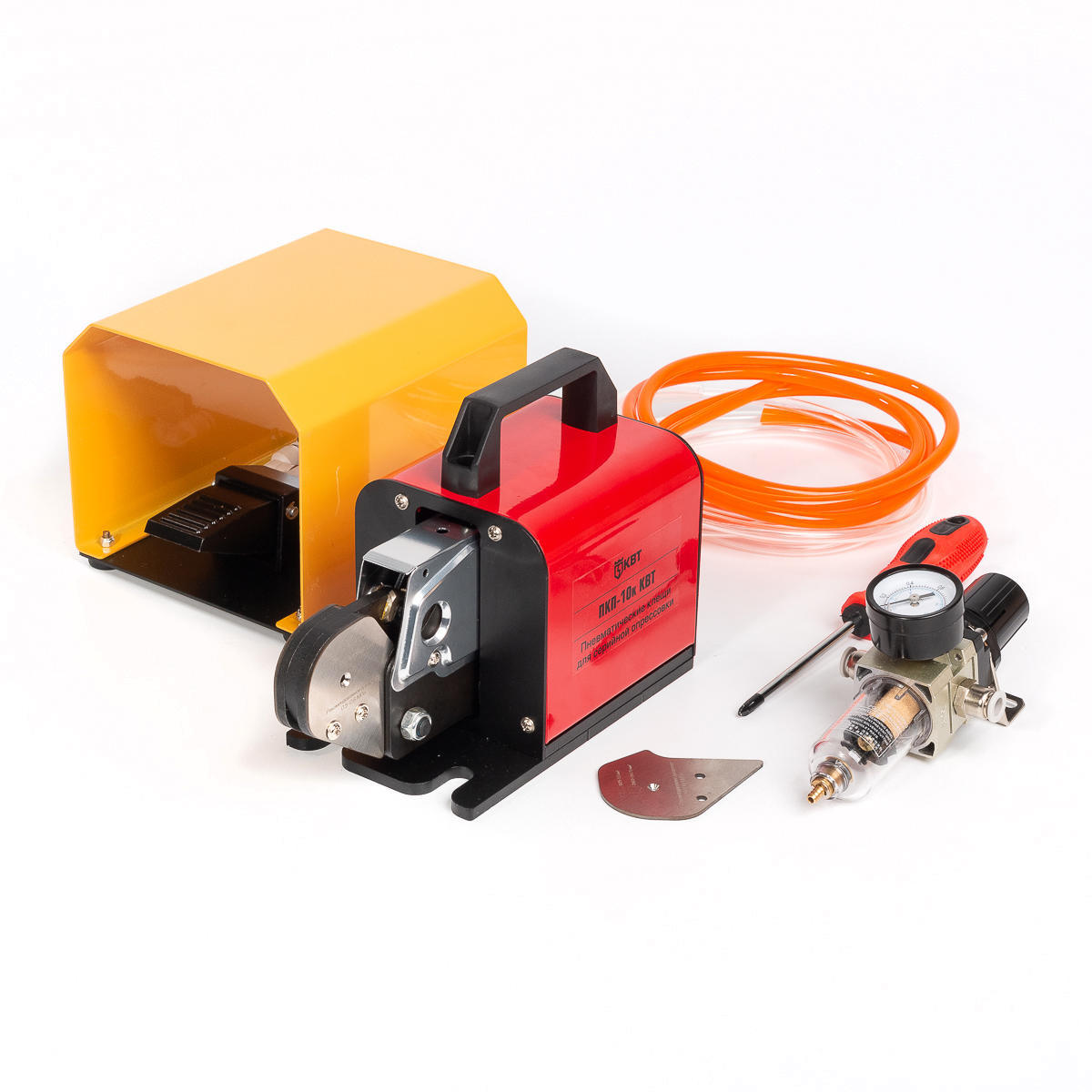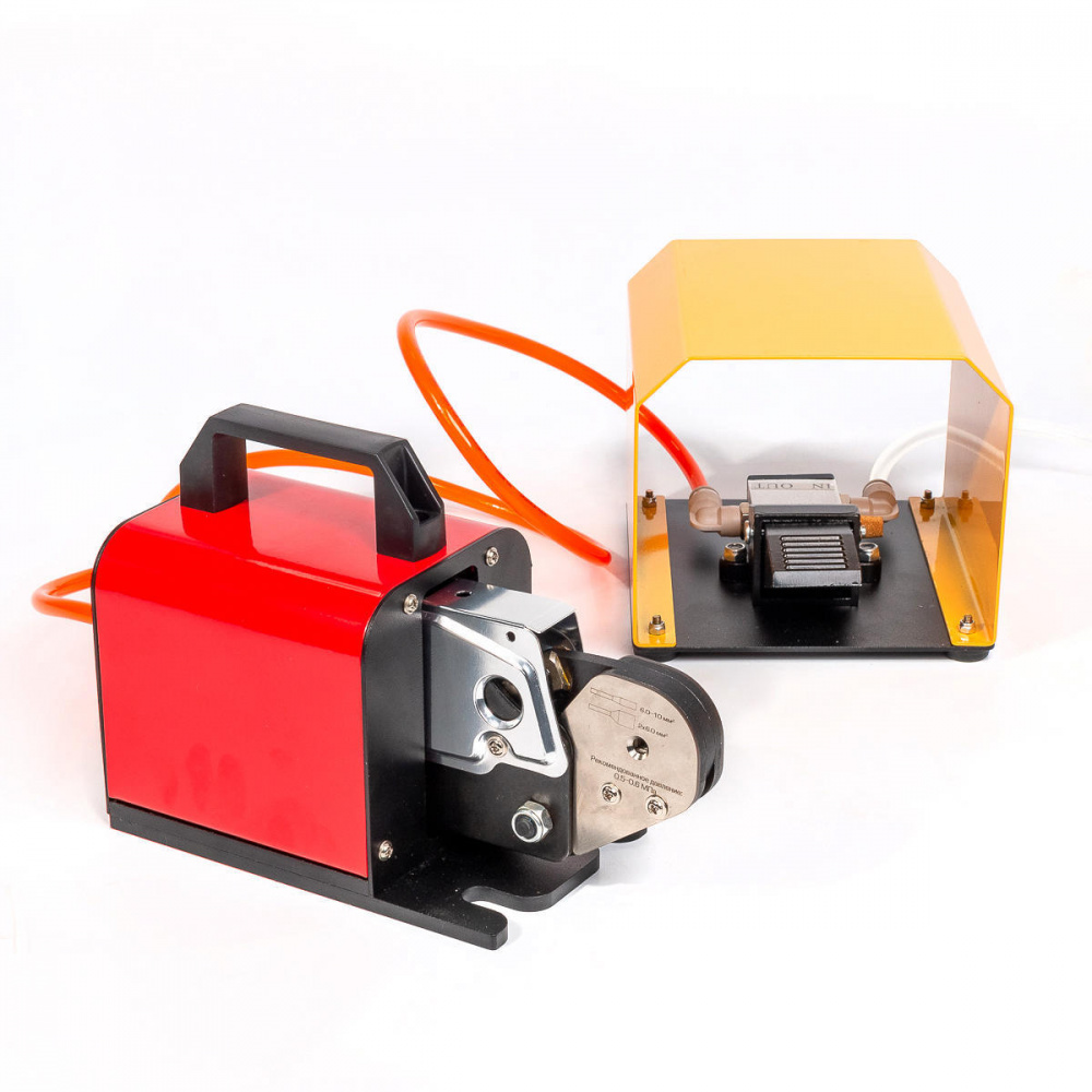 В комплекте: пневматические клещи, ножная педаль, воздушный шланг, 3 защитных пластины для работы с наконечниками до 1.5 м² / 2.5–4 мм² / 6–10 мм²