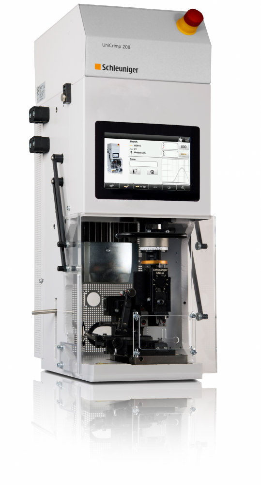 Пресс UniCrimp 208 сочетает в себе качественные характеристики проверенных обжимных прессов Schleuniger с современным и удобным дизайном. При усилии обжима 33 кН (3,3 тонны) UniCrimp 208 надежно и быстро соединяет все ленточные клеммы с задней и боковой подачей с проводником. Хорошо организованный 7-дюймовый сенсорный экран обеспечивает простое и прямое управление. Он может вмещать все распространенные механические или пневматические универсальные обжимные инструменты и соответствующий материал клемм. Опциональная полностью интегрированная система контроля усилия обжима ACO 08 обеспечивает повышенную гарантию качества.
