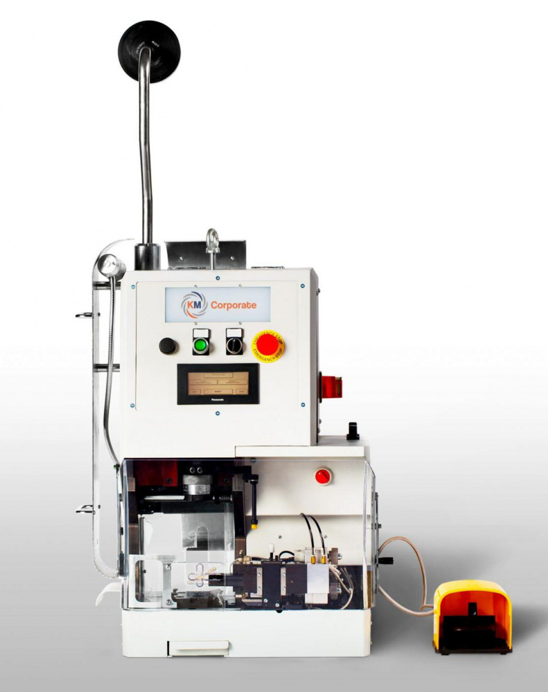 Пресс KM3011, предназначен для зачистки изоляции провода и последующей опрессовки контакта на зачищенный участок. Контакт в ленте подается, отрезается от ленты и обжимается в автоматическом режиме.