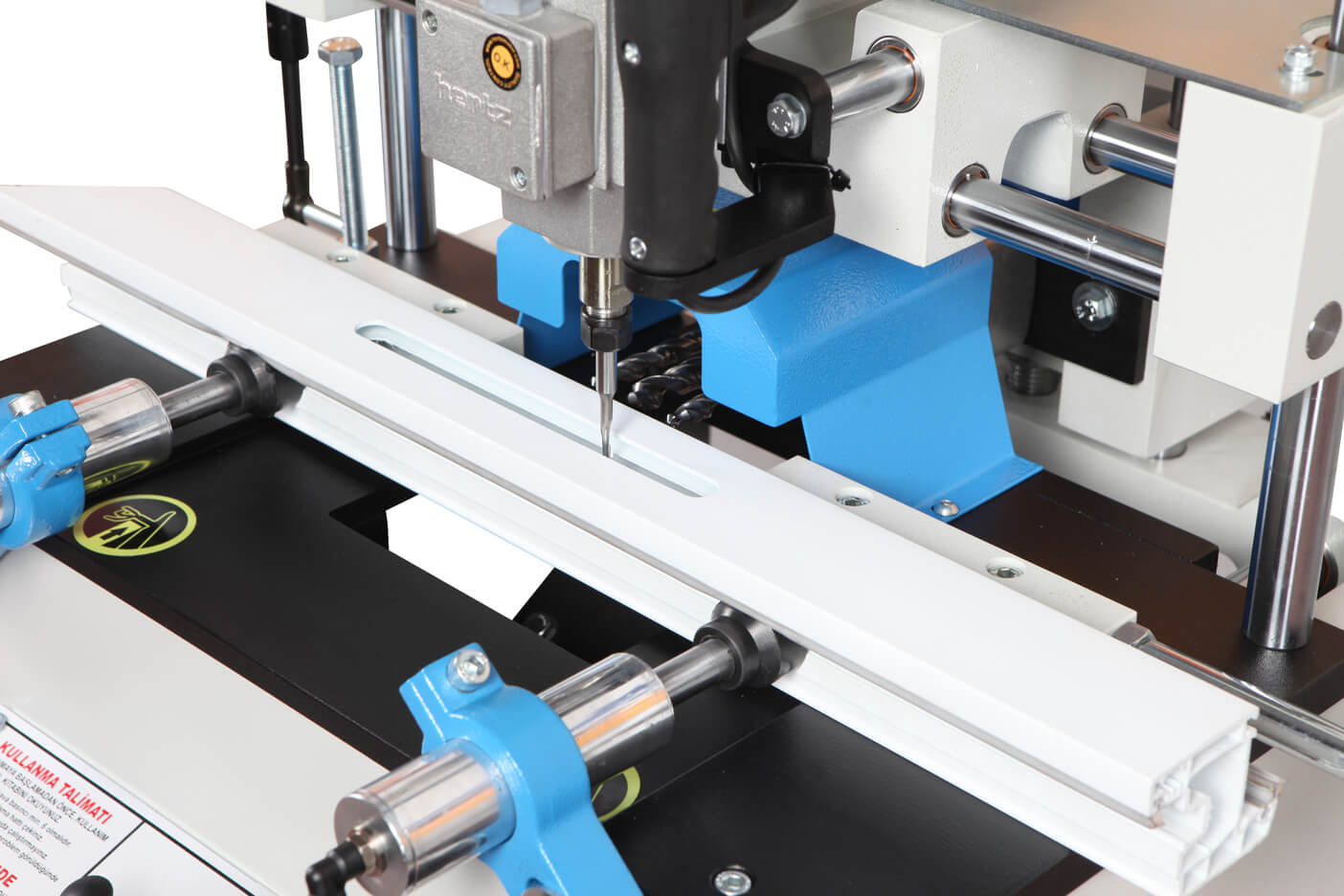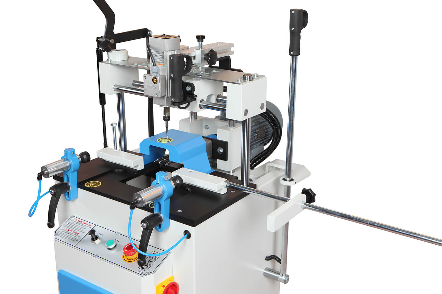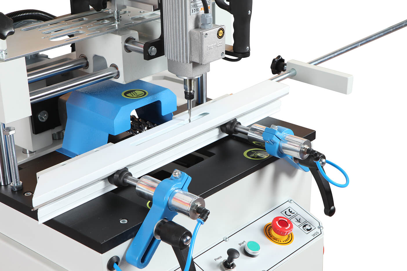 – Станок предназначен для сверления запоров, бочковых замков, отверстий для окон и дренажных отверстий в профилях из ПВХ и алюминия.