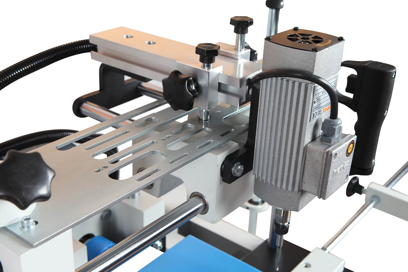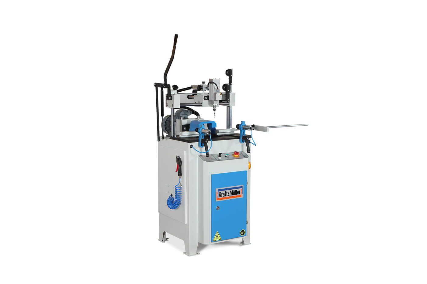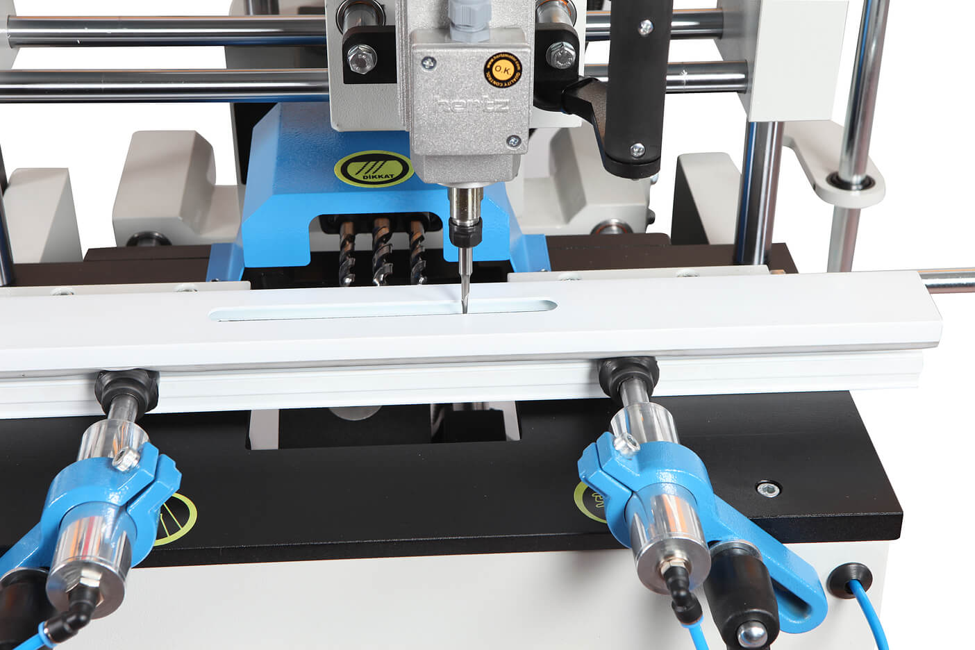 – Станок предназначен для сверления запоров, бочковых замков, отверстий для окон и дренажных отверстий в профилях из ПВХ и алюминия.