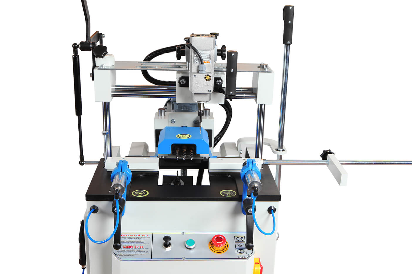 – Копировально-фрезерный станок со станком для сверления тройных водяных пазов для производства окон и дверей из ПВХ и алюминия.