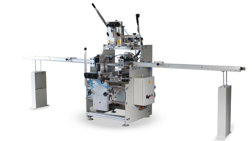 Станок имеет одну вертикальную и две горизонтальные фрезеровочные головки, применяется для фрезерования отверстий в алюминиевых профилей без переворачивания заготовки.